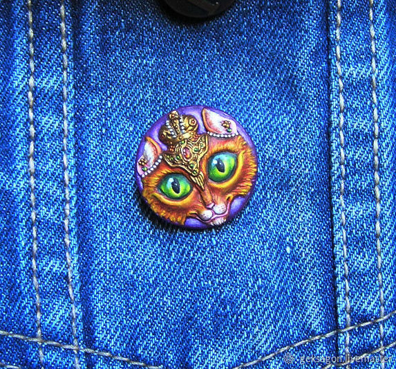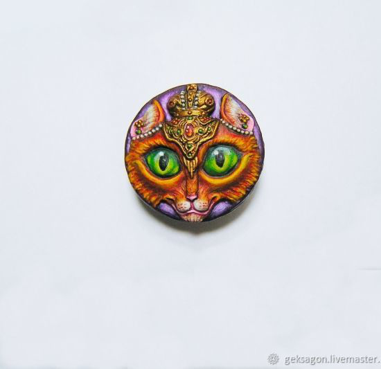 Брошь отлита из пластика, расписана вручную акрилом, покрыта матовым защитным лаком, закреплена на металлической основе с булавкой.