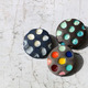 Набор маленьких брошей в горошек из полимерной глины с низкотемпературной эмалью в углублениях.. Серая «потертая» с цветным горошком, шоколадная с фактурой ткани и мятно-бирюзовым горошком и Темно-синяя «рубленая» с бежево-серым.
