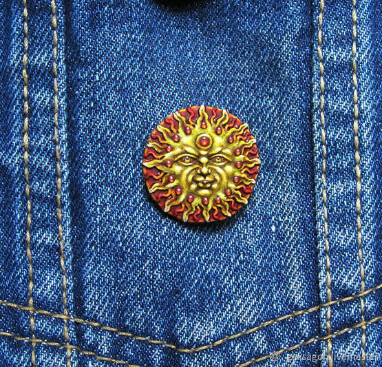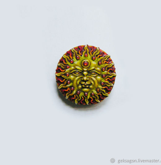 Брошь отлита из пластика, расписана вручную акриловыми красками, покрыта несколькими слоями лака, закреплена на металлической основе с булавкой.