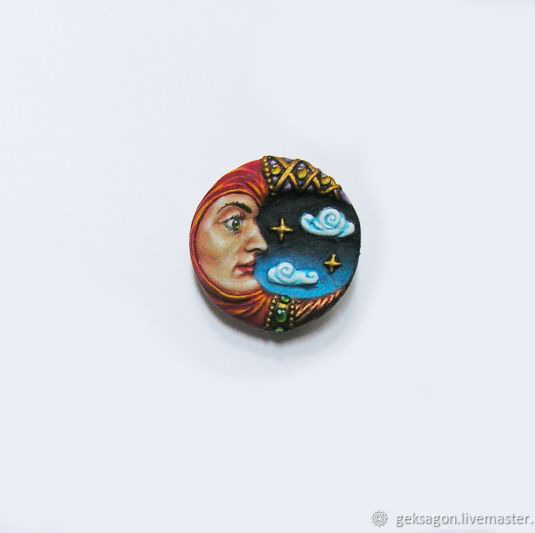 Брошь отлита из пластика, расписана вручную акрилом, покрыта матовым защитным лаком, закреплена на металлической основе с булавкой.