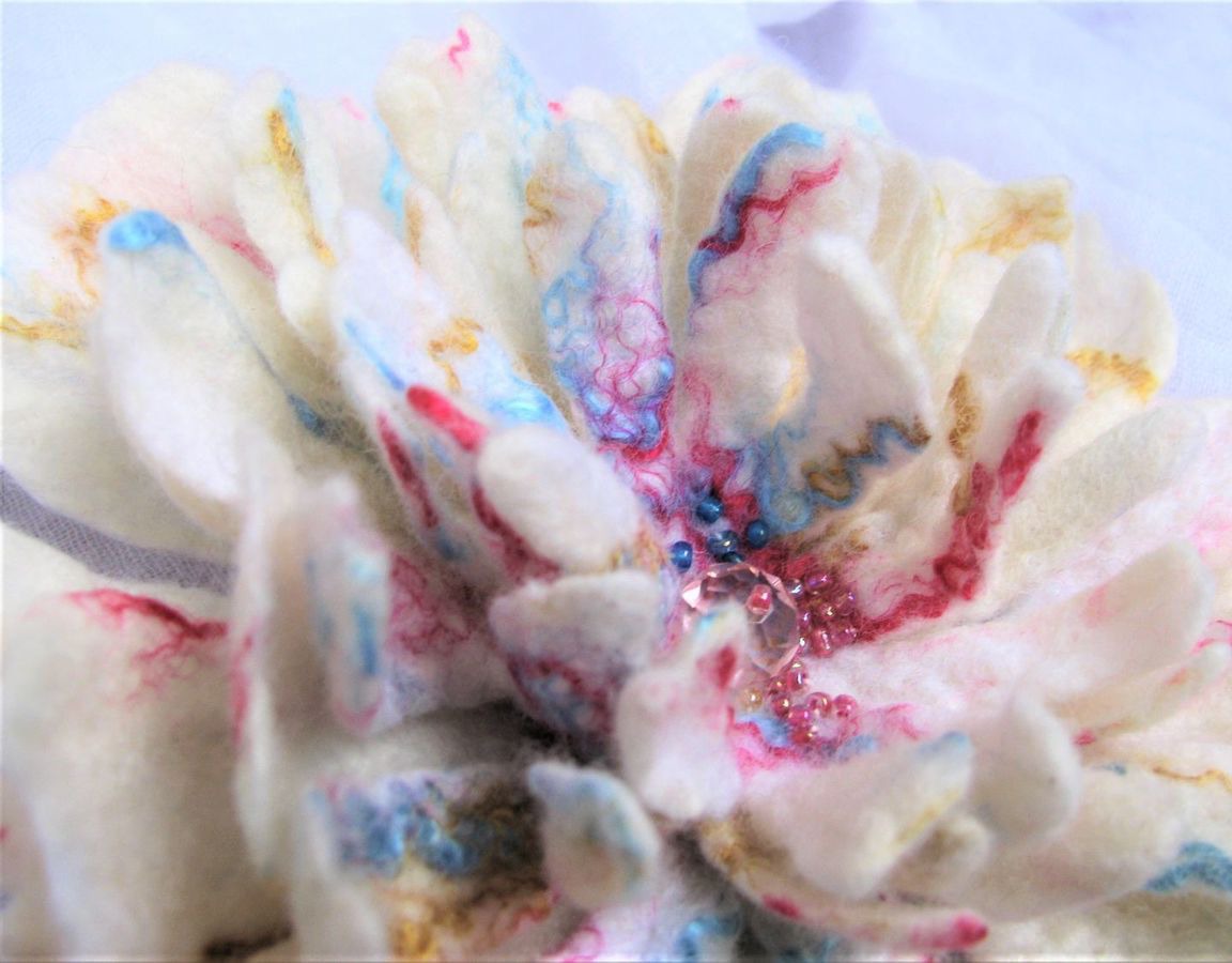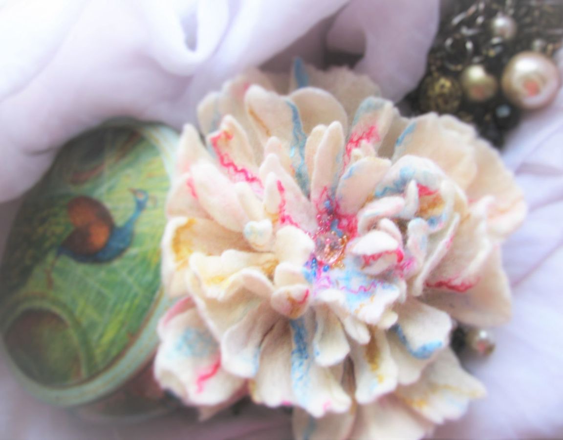 Необыкновенно нежная, воздушная брошь в форме белого пиона, центр цветка расшит бисером. Достаточно крупная -диаметр около 15 см, станет Вашим ярким украшением на любую одежду - почти невесома. Искрится волокнами розового, золотого и голубого шелка, в середине большая бусина сваровски и бисер в тон, словно прожилки цветка. Пион сделан в ручную из мериносовой шерсти. Возможно исполнение в любом другом цвете и другого размера.