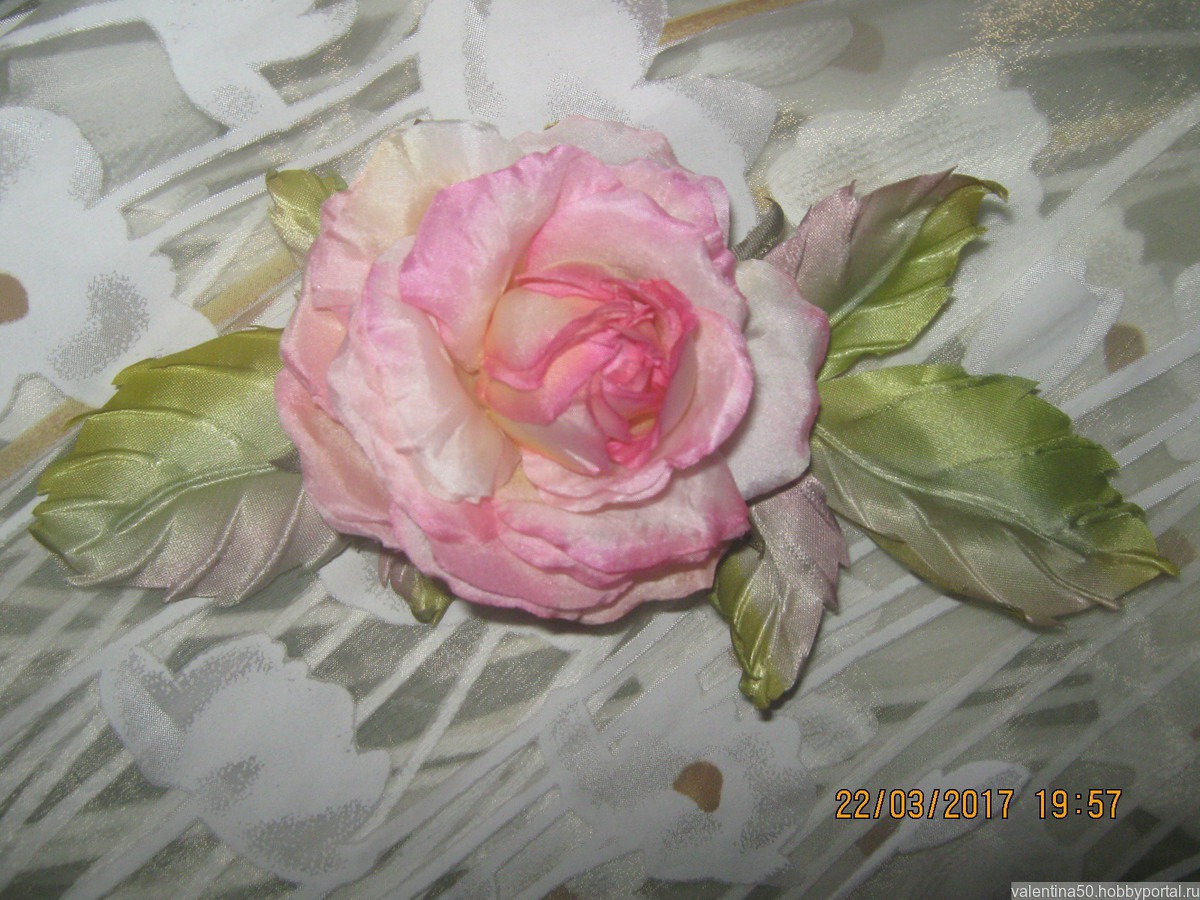 Роза очень нежная и легкая. Изготовлена из японского шёлка и атласа. Размер розы 8 см, с листиками 18см