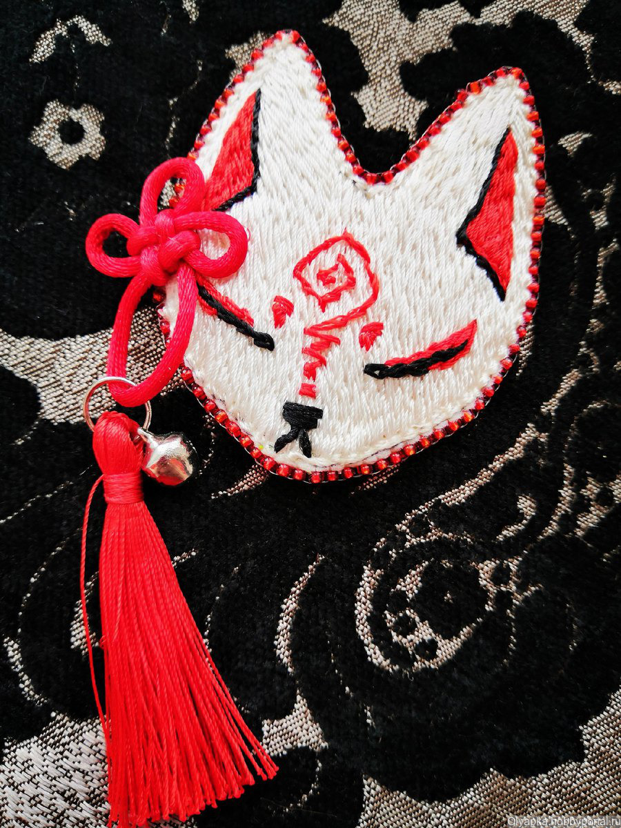 Мифическая, японская маска белой лисы. Брошь. Вышивка.