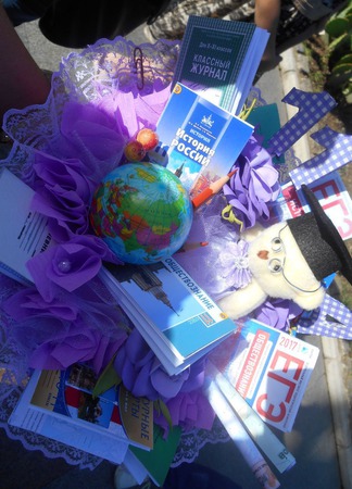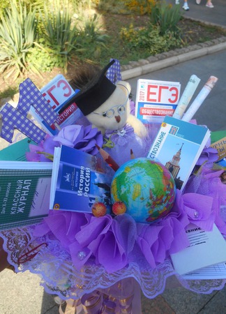 Ваша учительница будет единственная,кто получит такой букет на 1 сентября,последний звонок,День учителя,день рождения.В нем собраны все принадлежности с которыми учитель работает каждый день,в миниатюре!Учебники,тетради,дневник,сборники ЕГЭ и классный журнал и даже контурные карты и атласы.Имеются букетики для девочек.