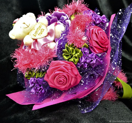 Букетик из игрушки и цветов из атласных лент, с декоративными вязаными пушистыми бантиками