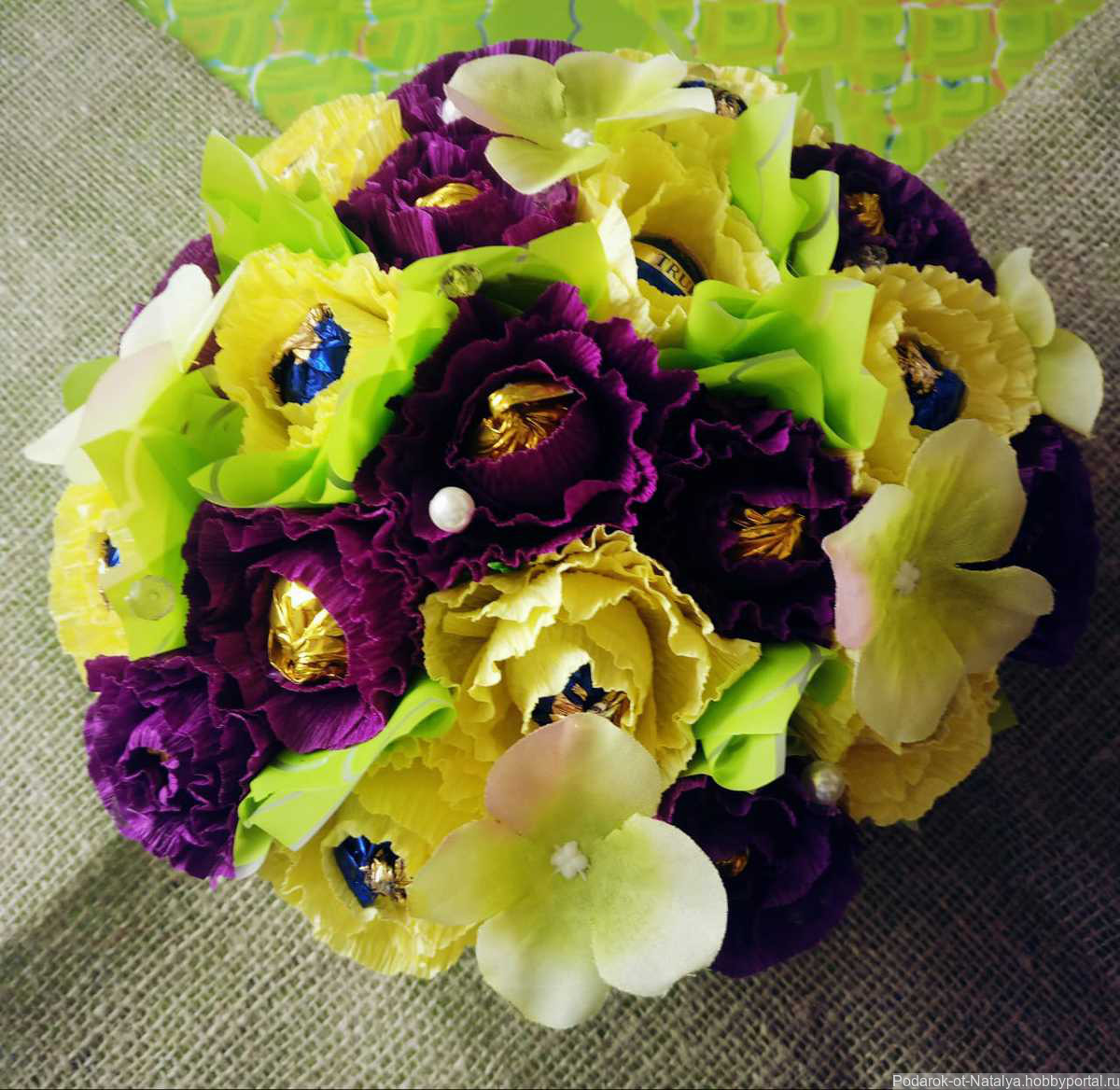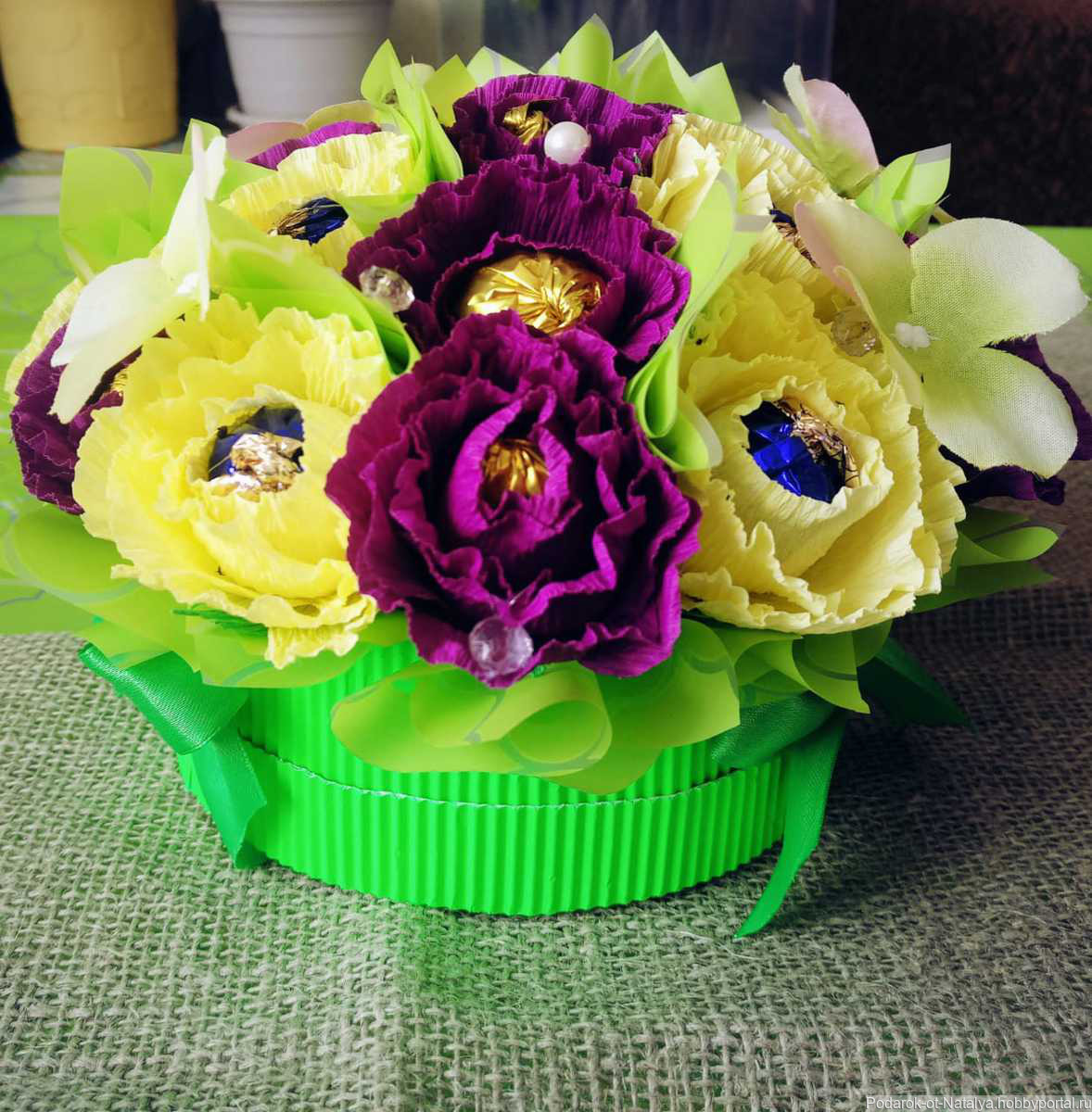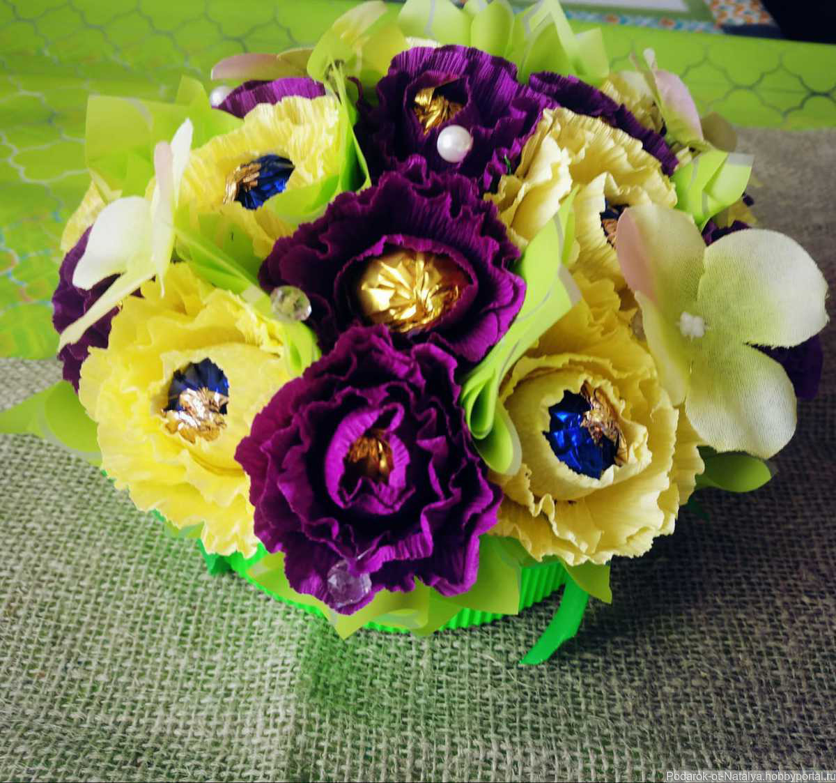 Получить на торжество букет красивейших цветов уже очаровательно, а если эти цветы ещё и со сладкими лакомствами внутри - то это поистине феерично. Такой букет можно подарить на торжество или просто порадовать маму или подругу сладкими конфетками в такой праздничной упаковке. Это превратит её обычный будний день в яркий и незабываемый праздник. Конфетные букеты не вянут, а радуют своим шикарным видом и вкусом! Это так душевно - конфеты с чаем ! Не требуется вода и сложный уход. Любые цвета и размеры. Конфетки достаются - цветы остаются ! Дарите близким людям свою любовь и внимание!