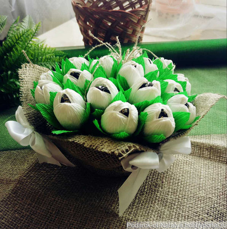Весенняя композиция из цветов ручной работы.В каждом цветке конфета "Марсианка".В подарочной упаковке, дополнена декоративыми элементами.Возможен другой вариант цветов в другом цвете,упаковке и количестве.