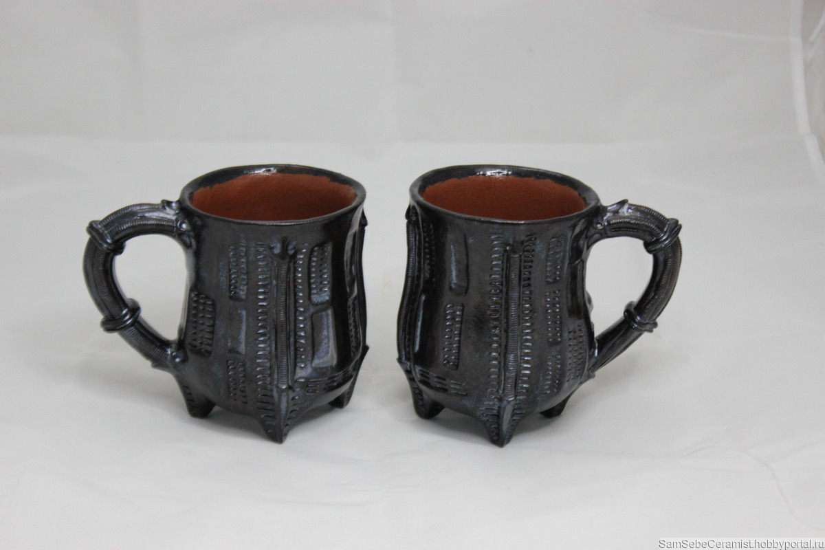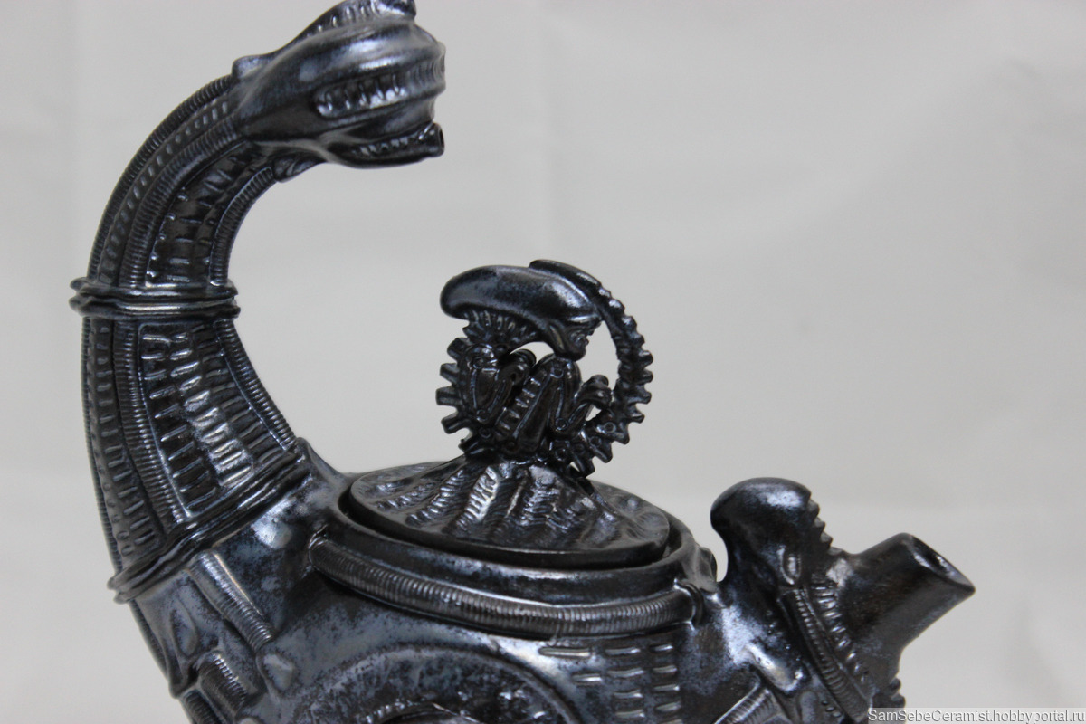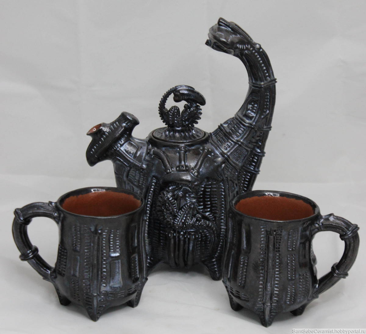 Чайник с планеты Инженеров. Лепится в ручную из пластов керамической массы. Обжигается при температуре 1060-1080 градусов. Внутри покрыт прозрачной глазурью, снаружи декорирован эффектарными глазурями без особой маркировки. Проходит "лимонный тест" и тест на кипяток. Кружки выполнены из тех же материалов и в той же технике. Возможно заказать чайник отдельно, цена чайник - 6500р. Объём чайника от 500 - 1500 мл.