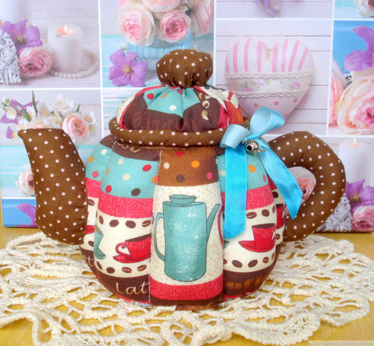 Текстильный чайник сшит из симпатичных тканей с кофейными рисунками.