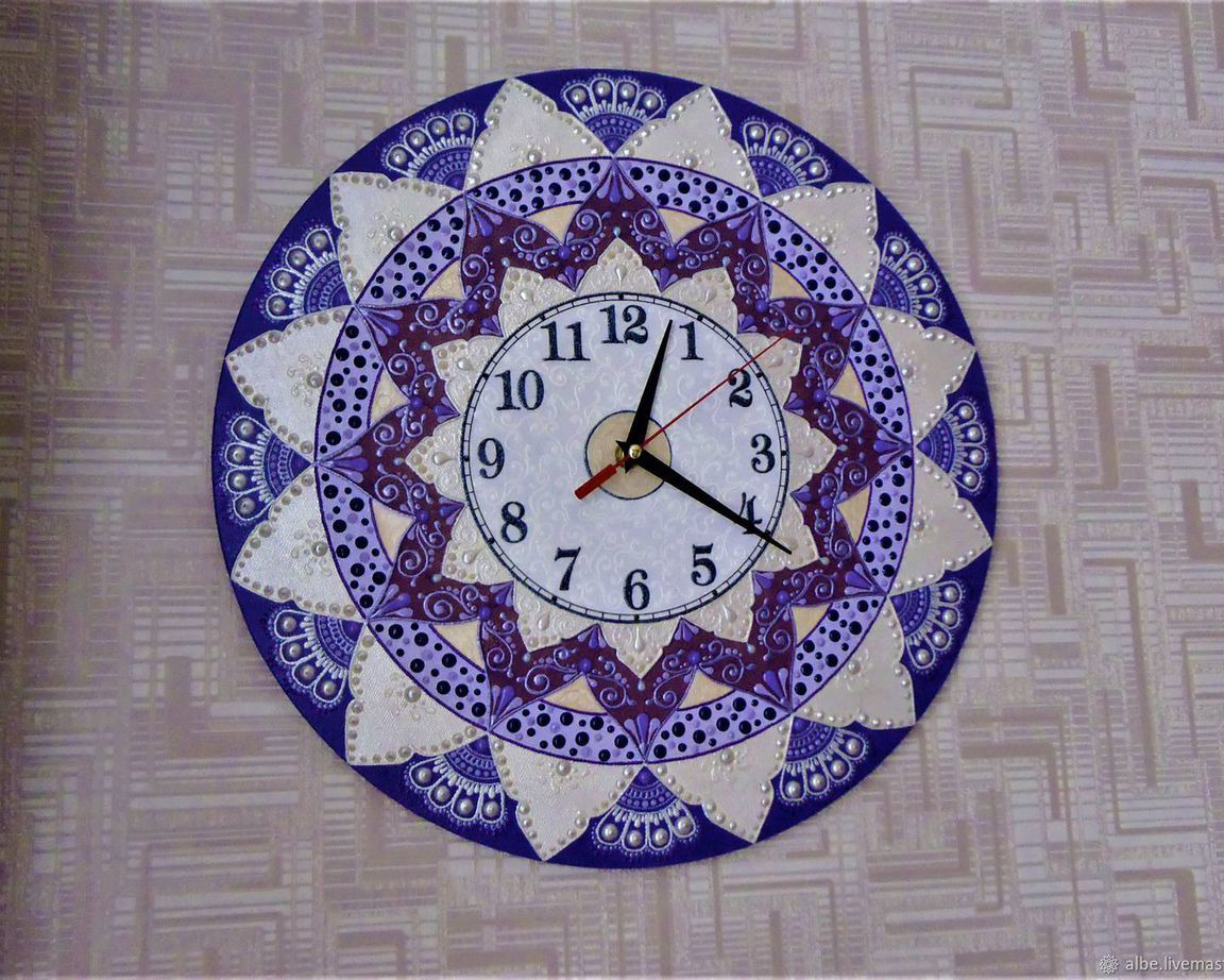 Часы в СИРЕНЕВОЙ и ФИОЛЕТОВОЙ гамме. Не синие! Ни один редактор не справился с фотографиями (или я такой фотограф) На часах нет синего цвета! Есть сиреневый, фиолетовый, светлое серебро, жемчужный - всё! Возможно выполнение в другой цветовой гамме.