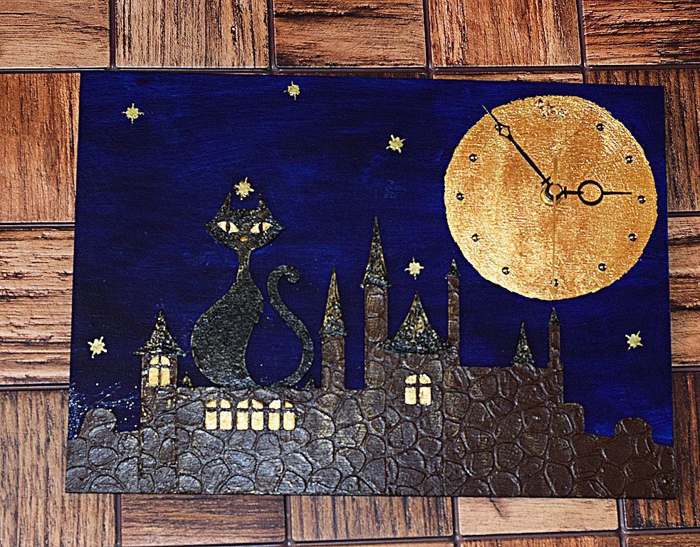 Необычные часы-панно для детской комнаты. Мистическая черная кошка на крыше, в сиянии луны)) Довольно большие, 35*25 см. В декоре использовались различные техники - объемные элементы, золочение, заливка ювелирной смолой. В работе использовались материалы на водной основе, без запаха.