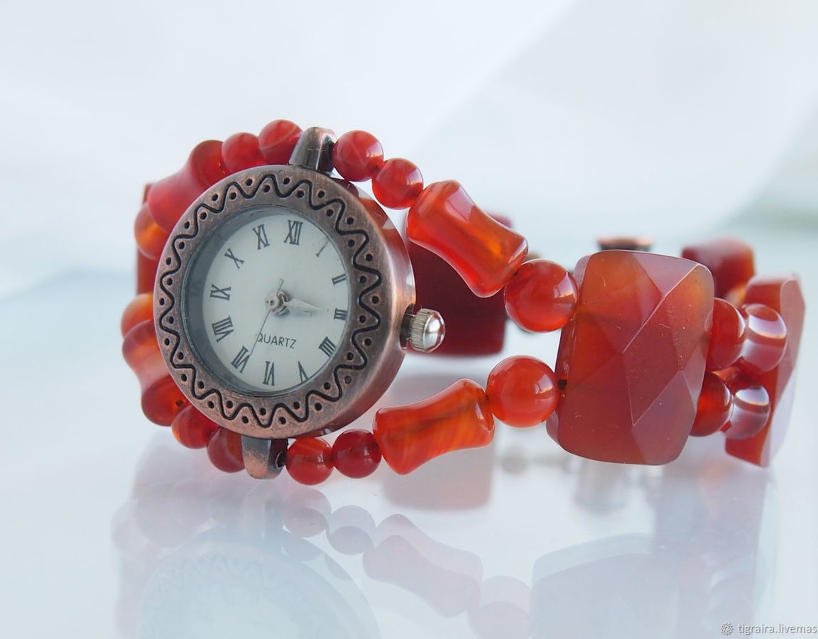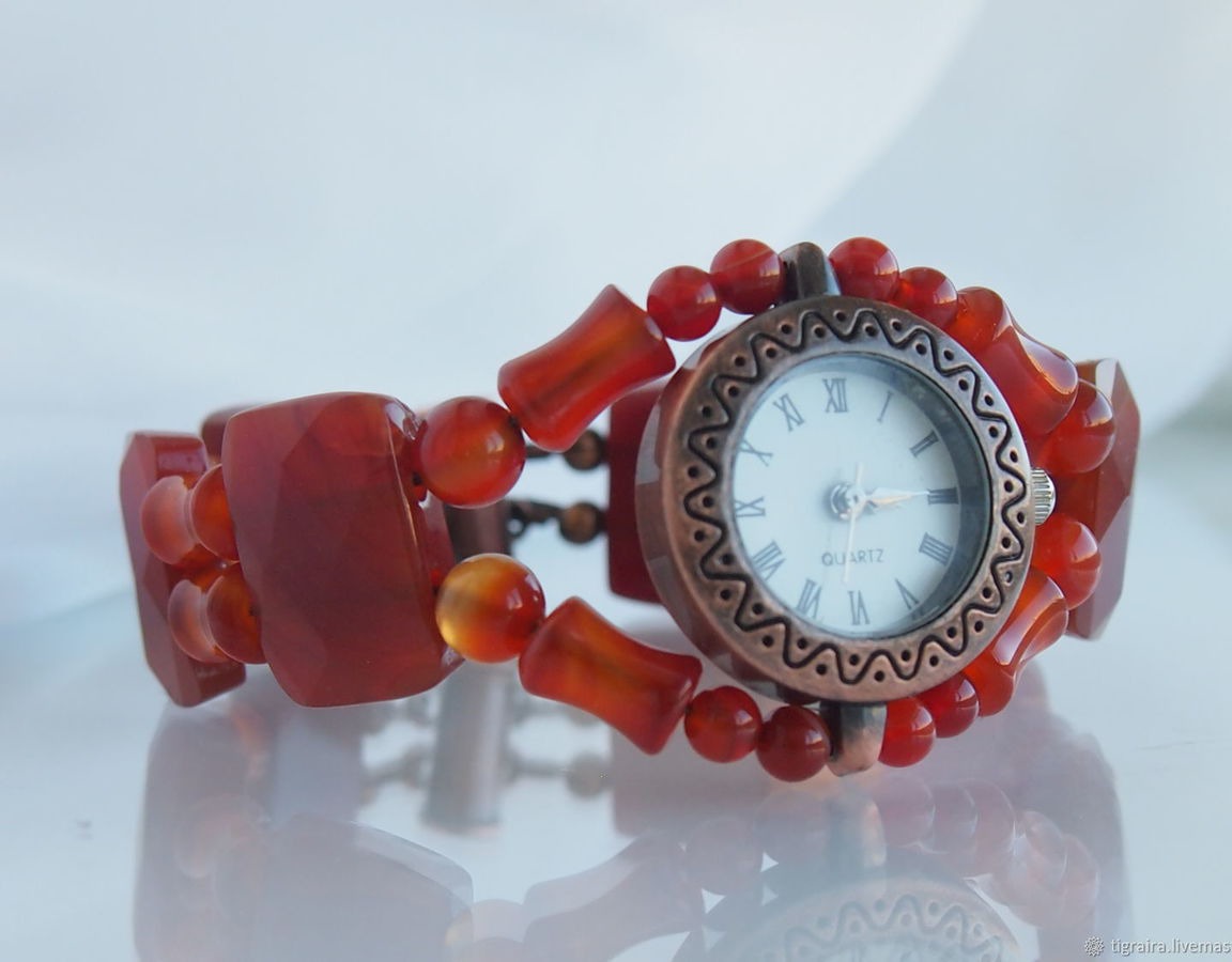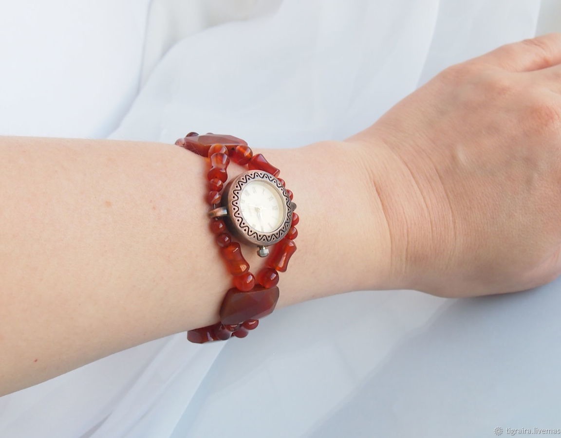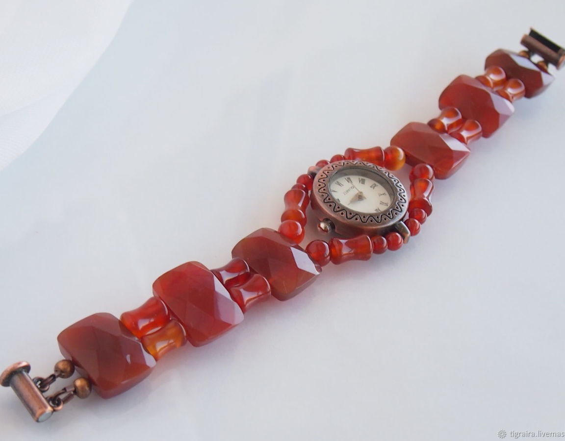 подарок девушке, подарок женщине, осень, красивое украшение, часы ручной работы, часы, рыжий, сердолик, часы наручные, часы женские, часы подарок