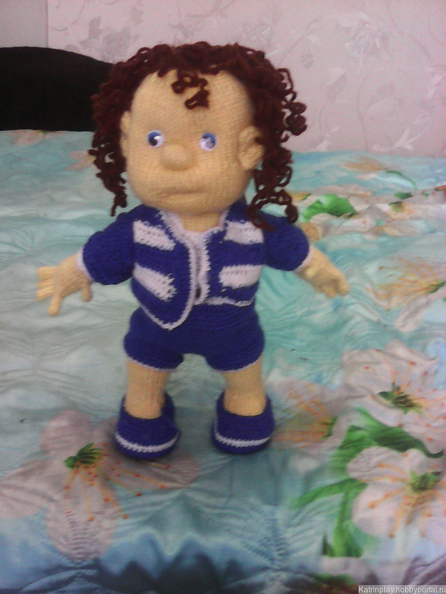 Кукла связана из пряжи 100% акрил,наполнитель холопвайзер,рост 35 см. Кукла хорошо стоит, руки и ногидвигаются. Одежда( тапочки,майка,кофта и шерты снимаются).