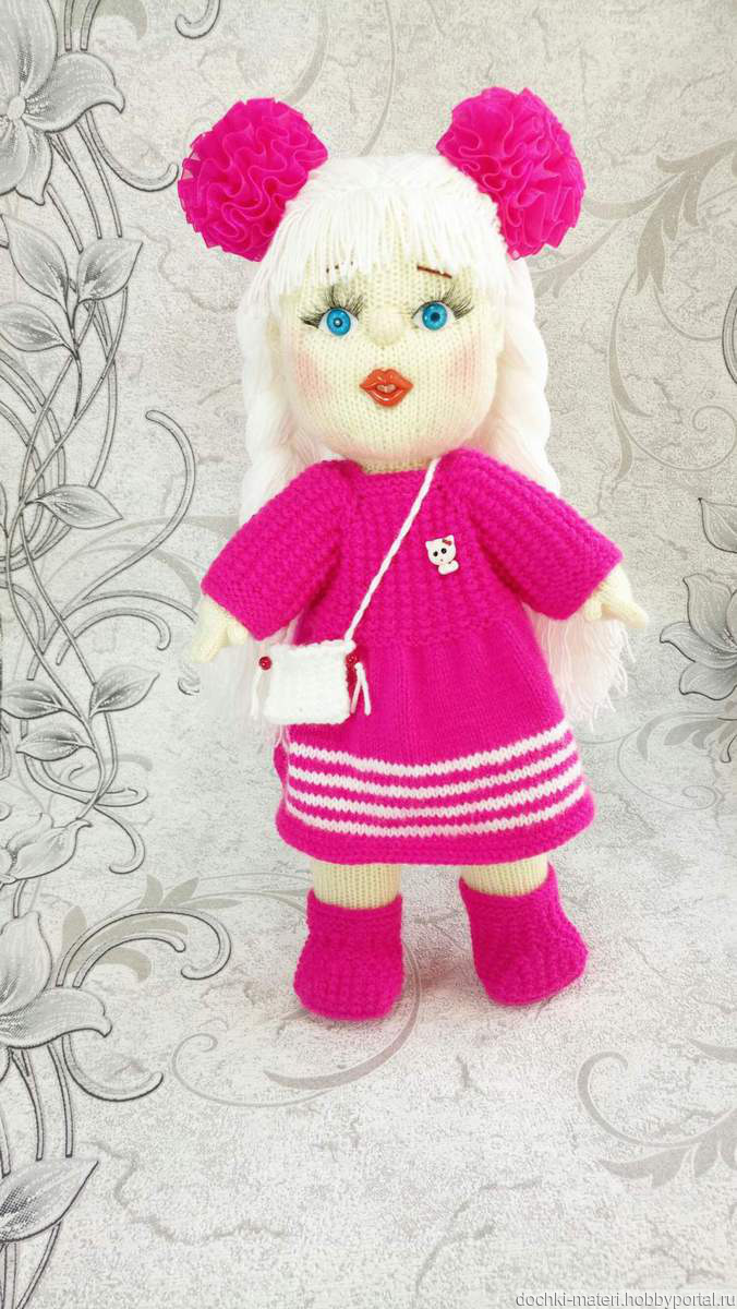 Кукла связана спицами. Рост 35 см, руки и ноги подвижны, одежда снимается, волосы можно расчесывать.