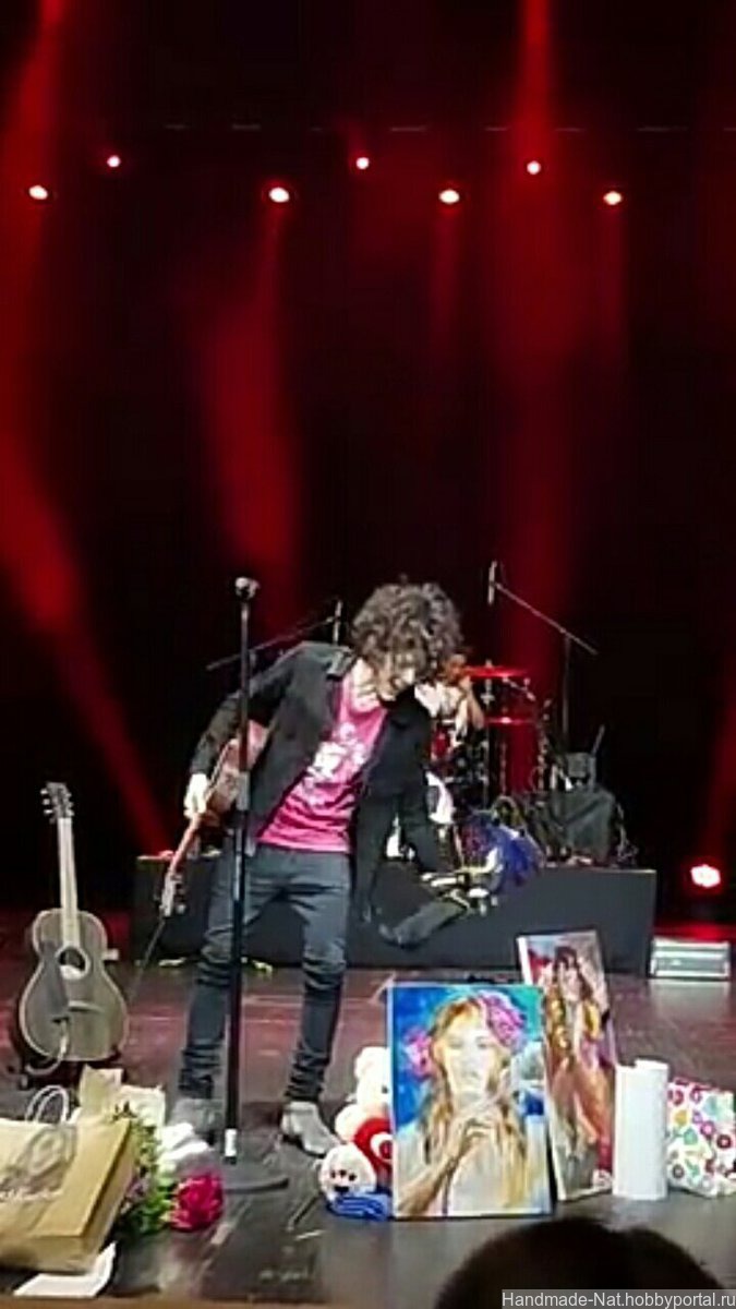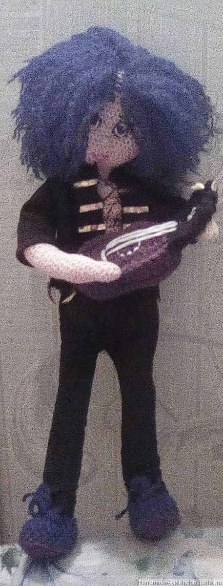Кукла связана крючком,одежда сшита из джинсовой ткани.20 июня в Москве,на концерте,куклу девочка ,заказчица,передала в руки певице Лауре Перголизи в подарок