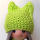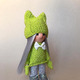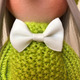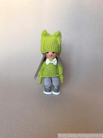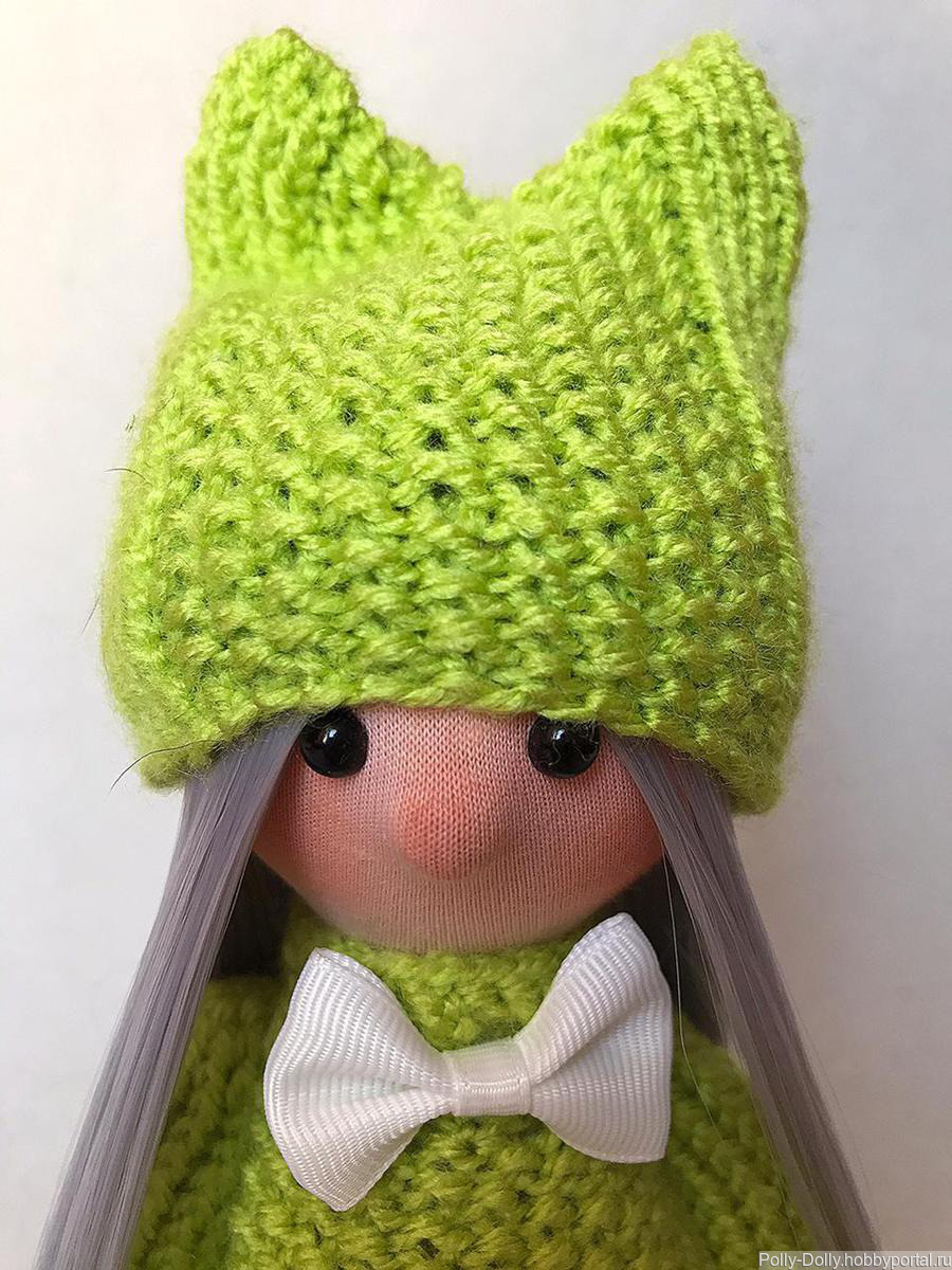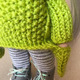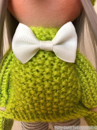 На головке шапочка цвета лайма гармонирует с ажурным свитерком оригинального покроя, украшенного белым бантиком