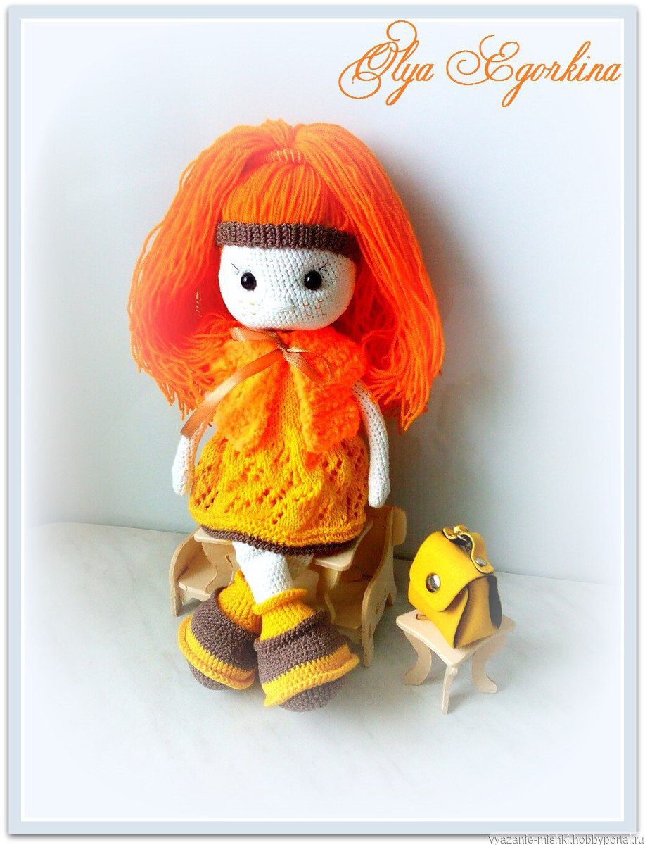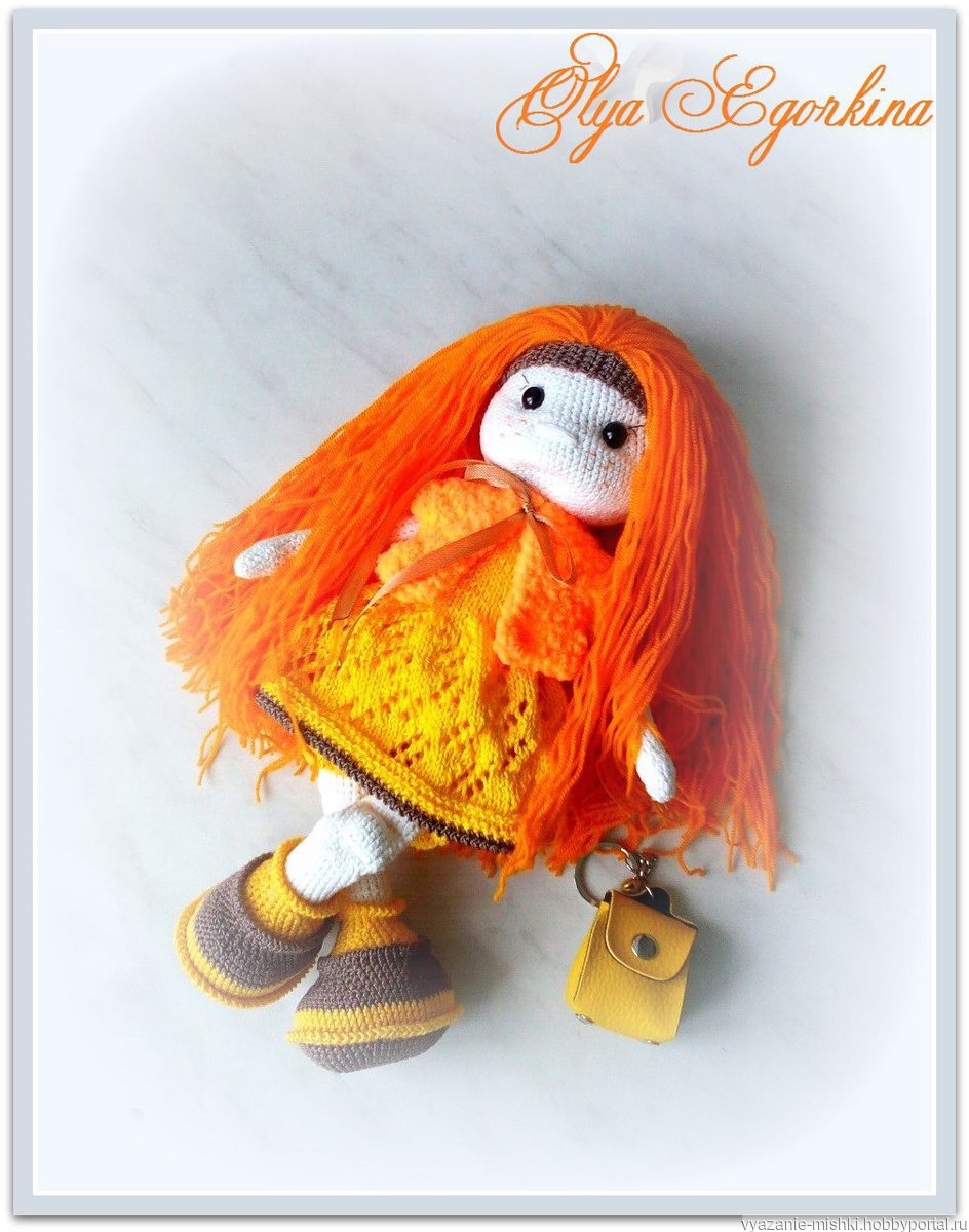 связалась вот такая рыжая девочка. Выполнена из хлопка, жилетка из Alize Softy, волосики - Троицкая "Акация". Ростом 30 см. Сама не стоит, ножки свободно болтаются. Платьице, жилетка и повязочка снимаются. Можно расчёсывать, заплетать косички, делать хвостики. При желании - даже сделать стрижку?. Один раз?.