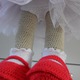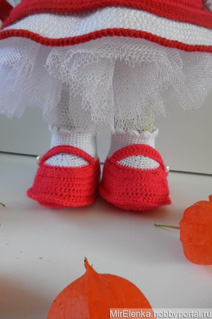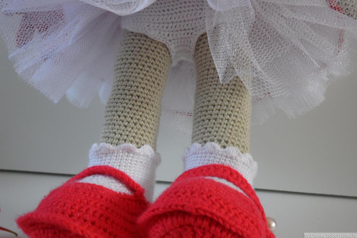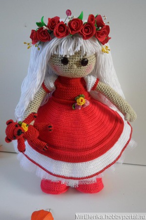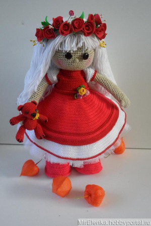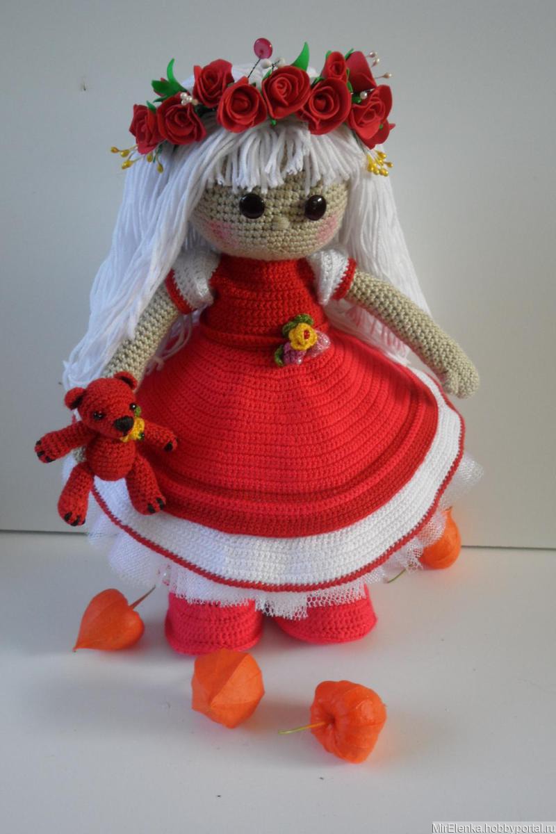 Вязаная девочка ростом 30 см. В комплект одежды входят :съемное платье,юбочка из фатина,трусики,туфельки с носочками,веночек из цветочков.Вся одежда съемная.Мишка в подарок.