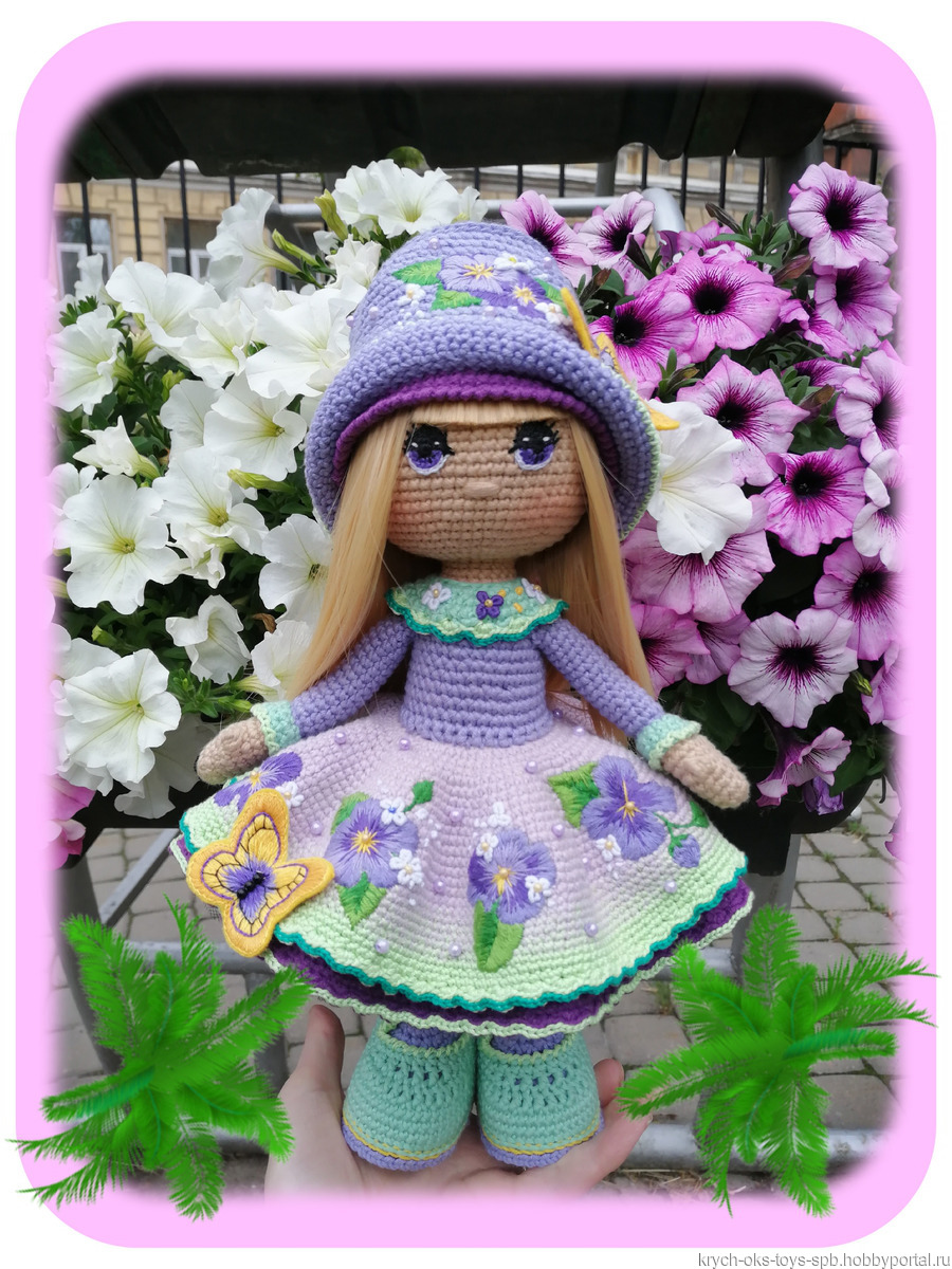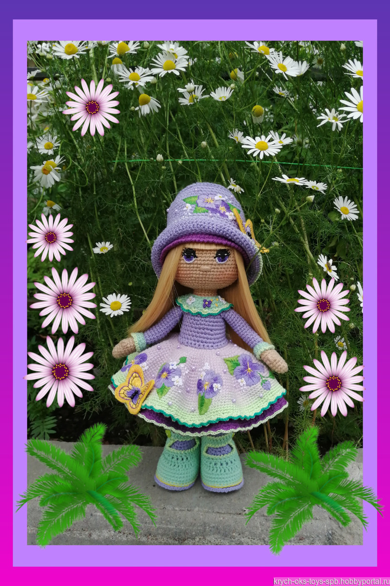 Кукла интерьерно-игровая. Связана крючком из полухлопковой пряжи . Наполнена холлофайбером и любовью ). Во всем теле проволочный каркас . На юбочке и шапочке - ручная вышивка гладью, бабочки тоже вышиты вручную. Рост 35 сантиметров .