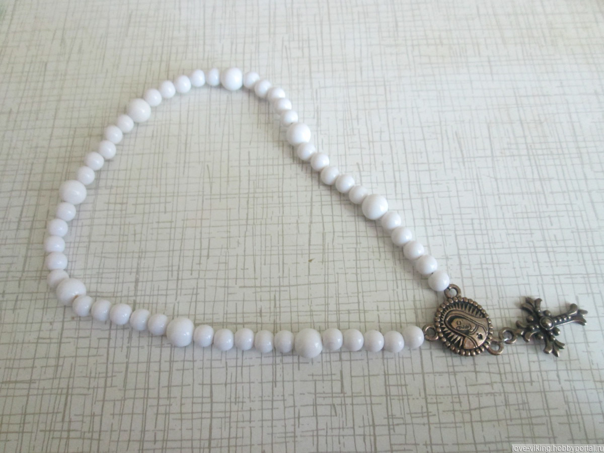 Чётки из белых бусин с двусторонним коннектором (с одной стороны роза, а с другой - Богоматерь) и крестом
