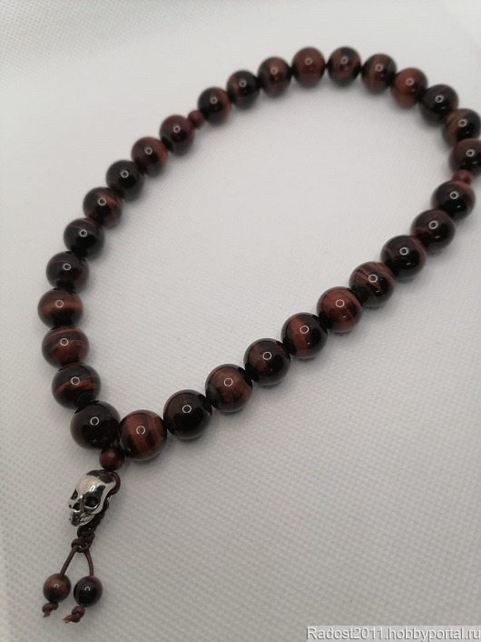 Четки из Бычьего глаза или, как его еще называют, Тигрового глаза. Это полудрагоценный камень с золотисто-коричневыми полосами, которые напоминают глаз тигра. Бусины диаметром 10,5мм. Разделительные бусины дерево вишня. Центральная бусина в виде черепа - знак выдержки и спокойной внутренней силы. Четки собраны на натуральном кожаном шнуре 1мм.