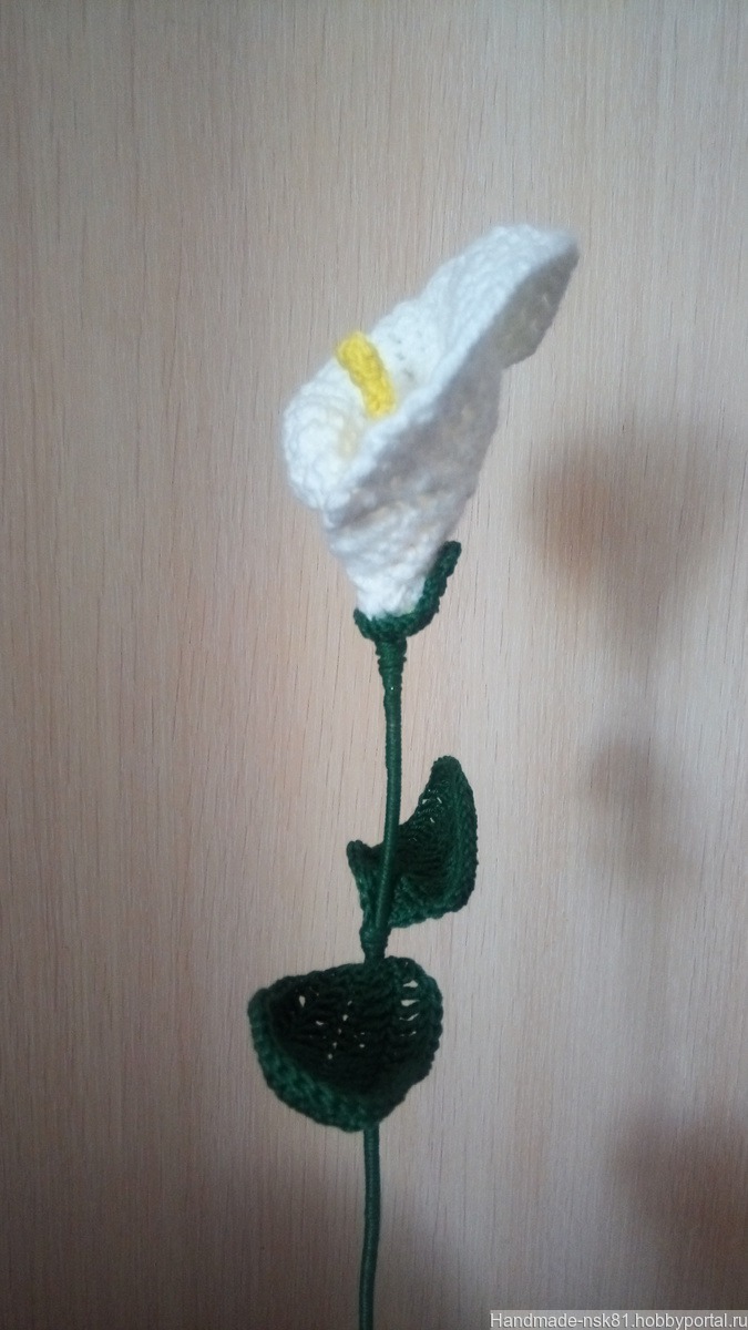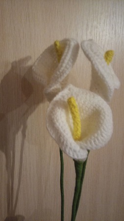 Цветы связанные крючком. Цена указана за один цветок. Каллы букетом из 3х штук стоят 300 руб за букет (100 руб штука). Большая синяя роза высотой 37 см и диаметром цветка 11 см стоит 400 руб. Эти цветочки не увянут и будут долго радовать вас своей красотой и нежностью.