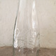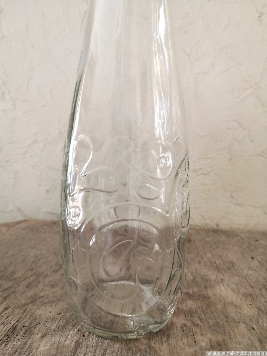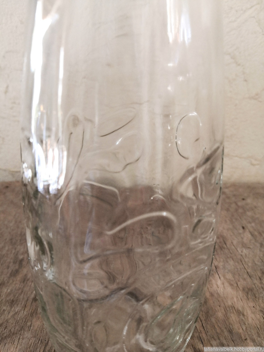 Зауженная к верху бутылка прозрачного стекла. Низ украшен Выпуклым рисунком - контурами "капель" разной формы. Есть даже в форме сердечка)
