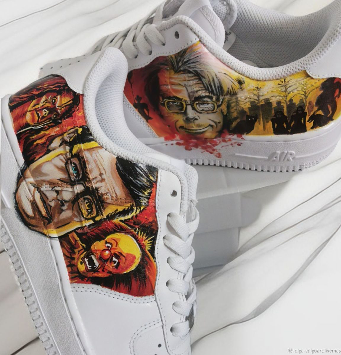 Привет! У меня есть уникальные кроссовки Nike, которые точно привлекут внимание всех поклонников Стивена Кинга. Они выполнены в стильном белом цвете с потрясающей росписью, вдохновленной произведениями этого великого автора.