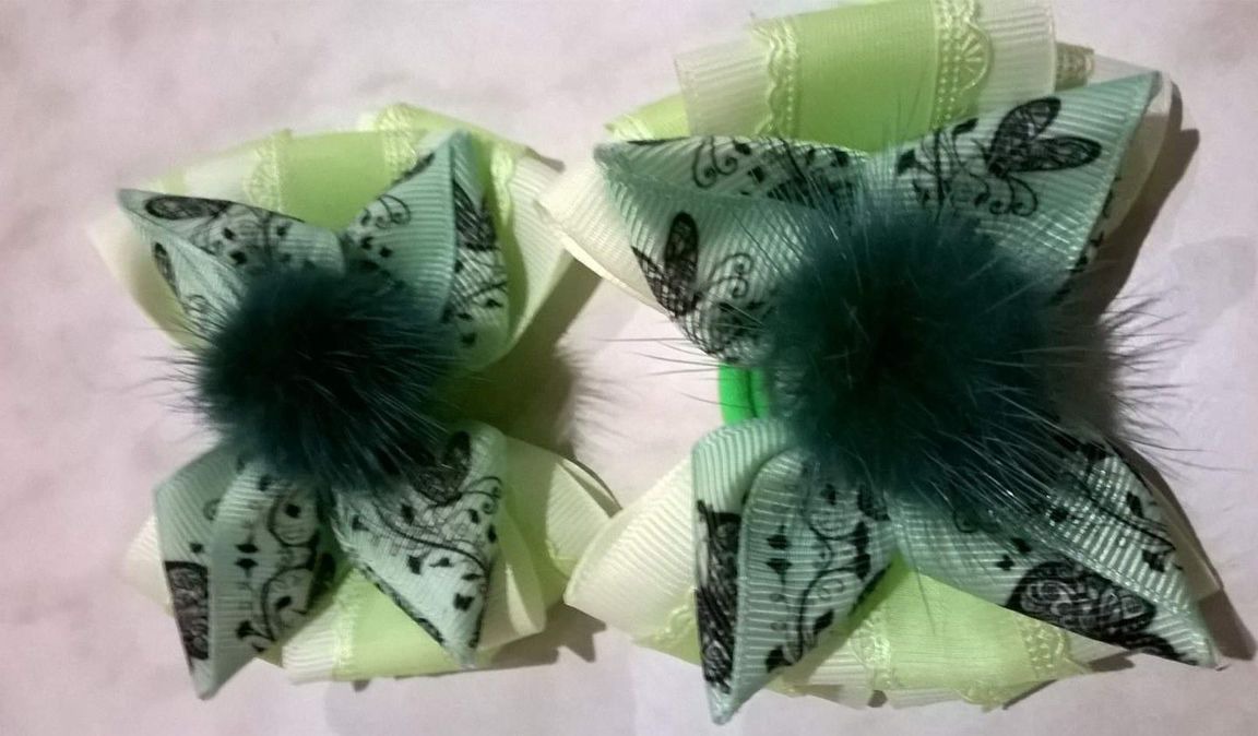 Бантики "нежная зелень" изготовлены из качественных репсовых лент, декоративной органзы, меха норки, на резинках