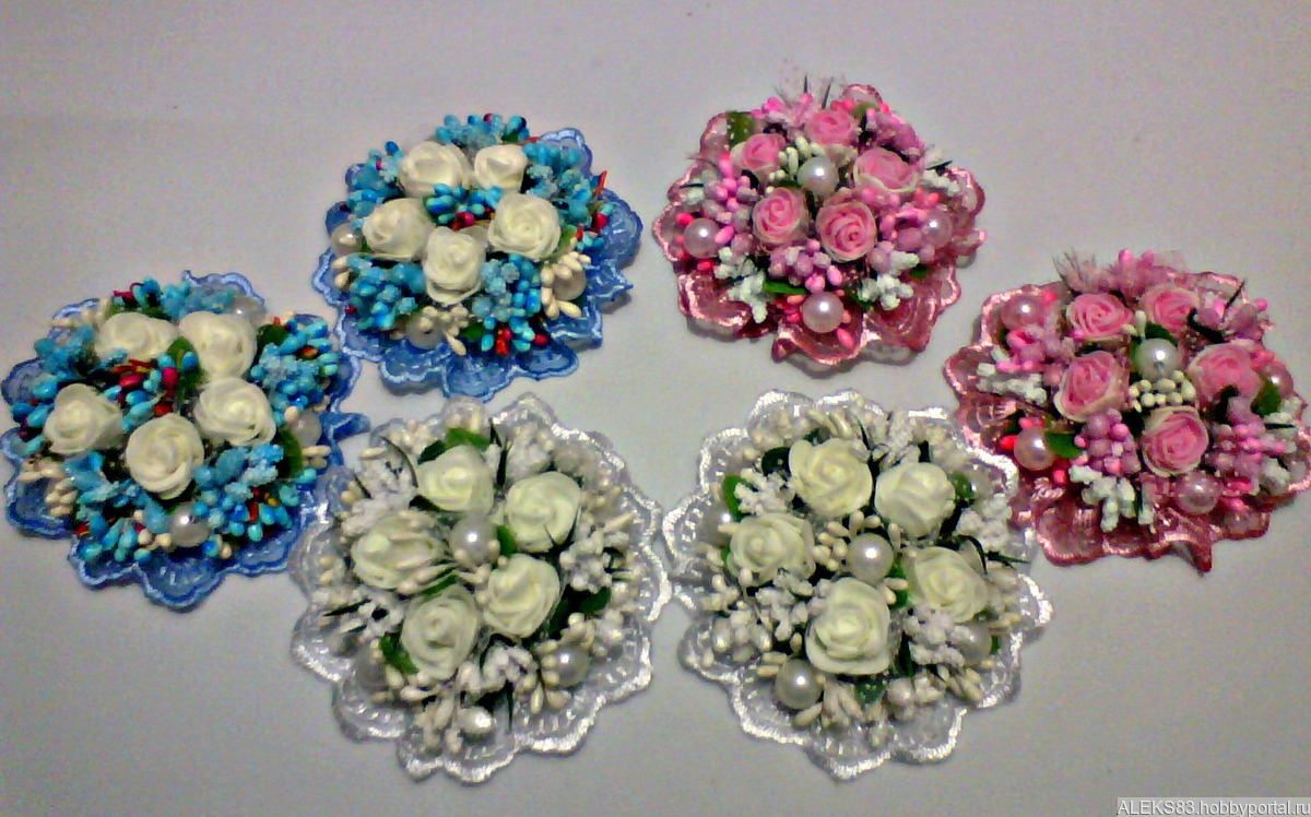 яркие резиночки из роз,бусин и сахарных тычинок.