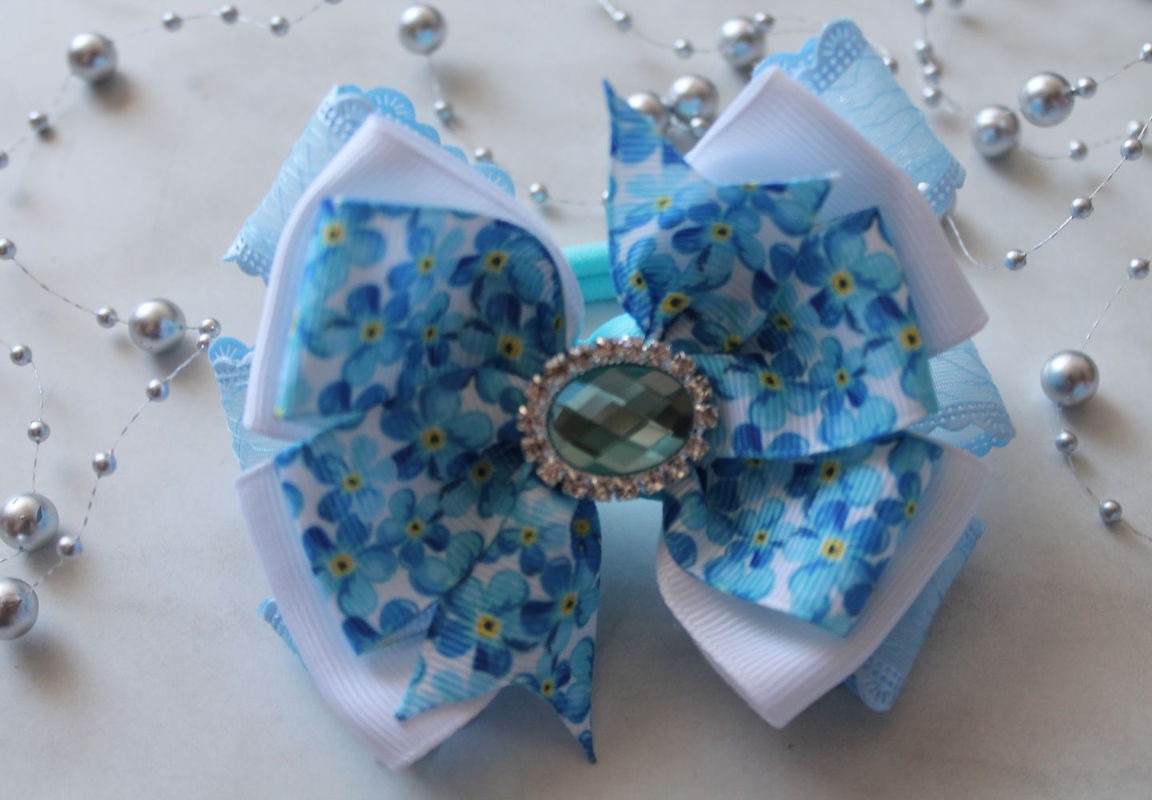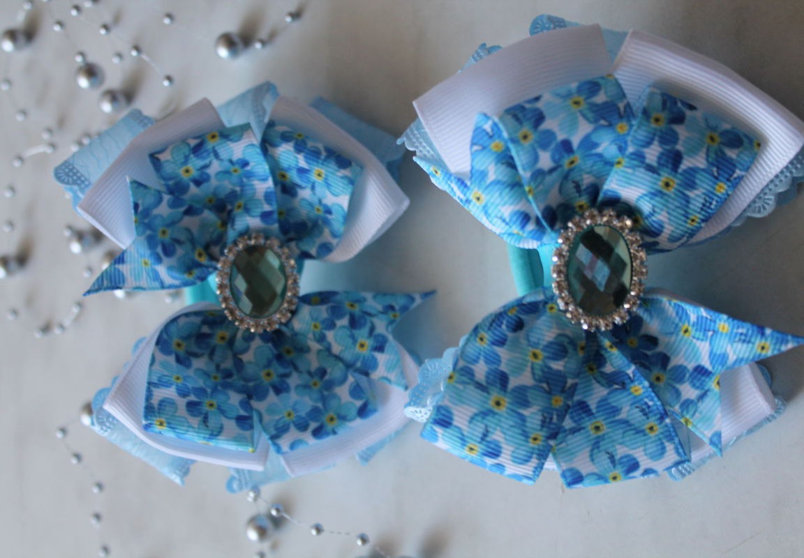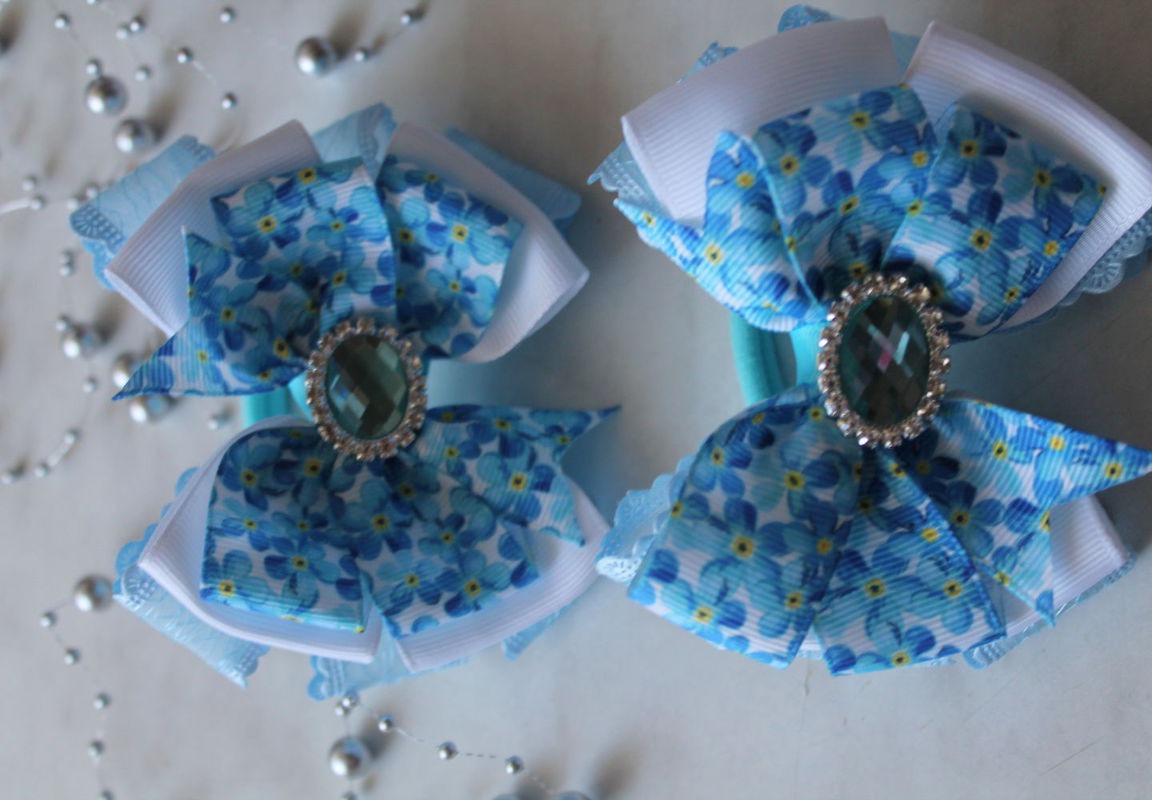 Нежнейшие бело-голубые бантики из репсовых лент с цветочным принтом Незабудки и большим переливающим голубым камнем ограненный стразами, мечта любой маленькой модницы
