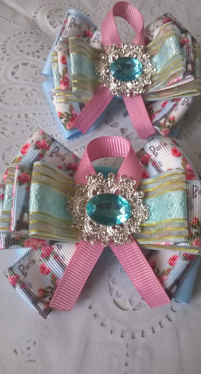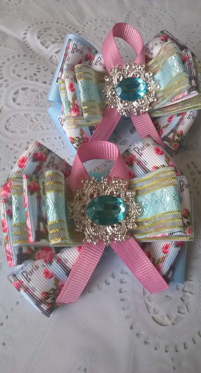 Нежные бантики из репсовых лент Париж в цветах с красивым нежно голубым камнем, на резинках
