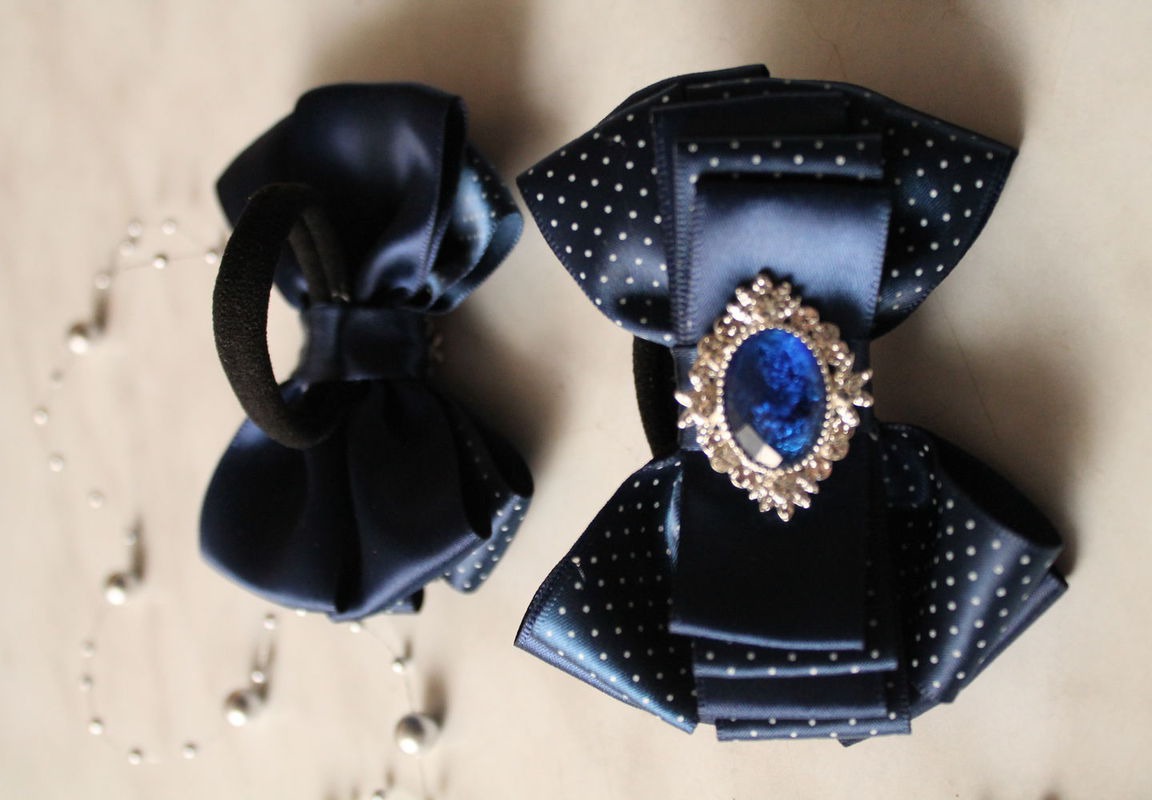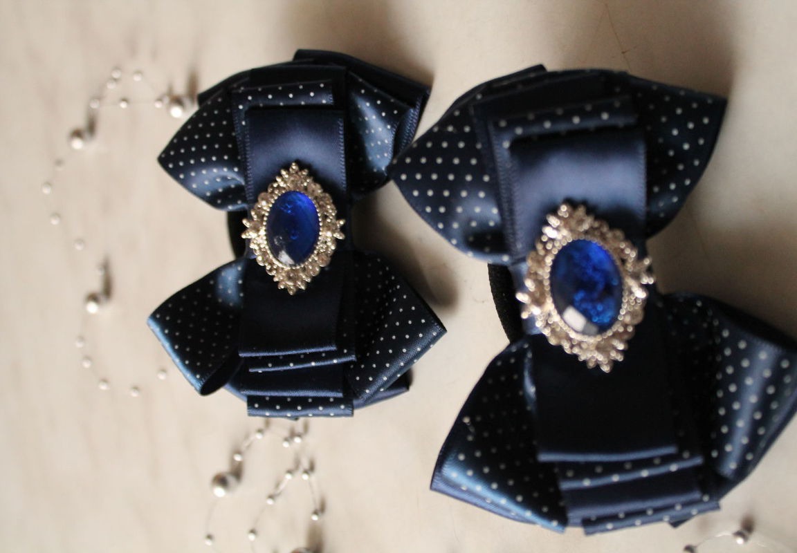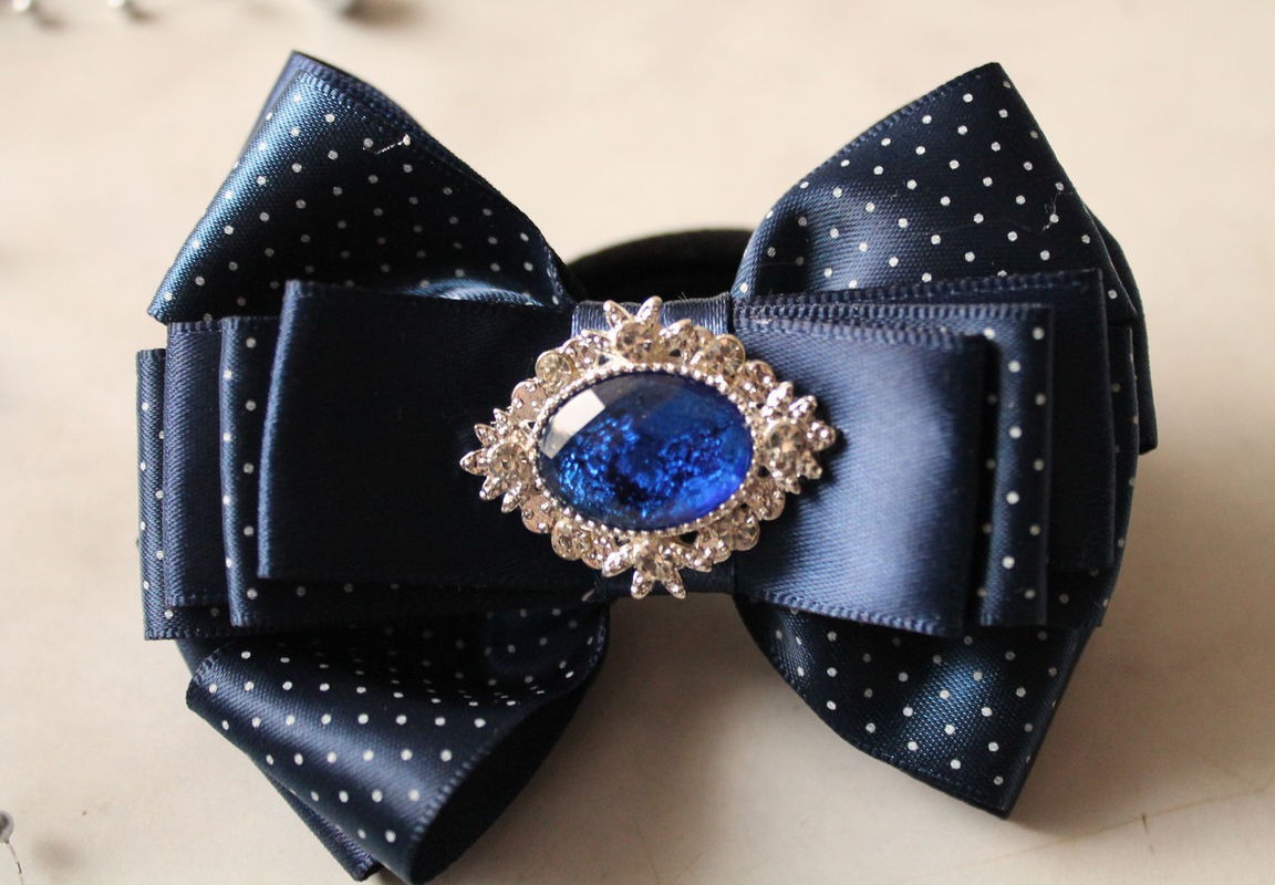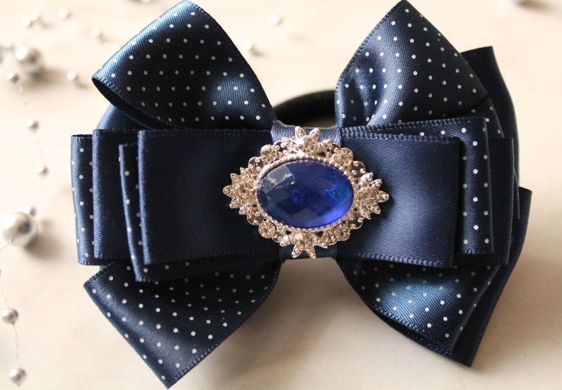 Темно-синие бантики с мелким горошком, изготовлены из качественных сатиновых лент с красивым камнем, мечта любой маленькой модницы