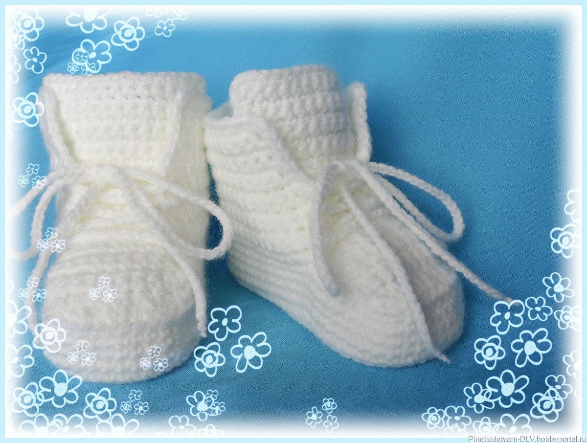 Пинетки-ботиночки или пинетки-кеды подойдут как для девочки так и для мальчика. Очень хорошо сидят на ножке ребенка и крепко держатся благодаря шнурочкам.