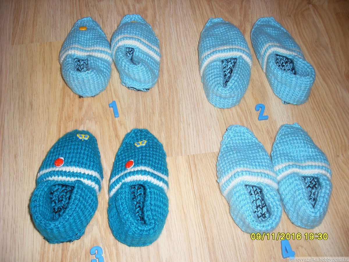 Предлагаю тапочки для малыша (как мальчика так и девочки) ручной вязки. Пряжа полушерсть, стопа усилена дополнительно носочной пряжей.