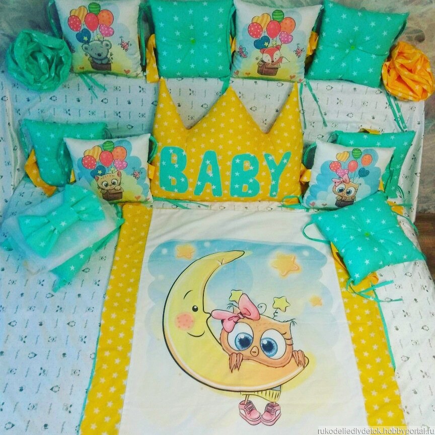 Бортики на все стороны + постельное белье (наволочка, простынь на резинке на круглую кровать, простынь на резинке на овальную кровать, пододеяльник), балдахин на овальную кроватку. Ручная работа. Ткань сатин, наполнитель гипоаллергенный холлофайбер. Воплощу любую Вашу идею в жизнь )) Помогу с выбором ткани. Срок изготовления на заказ 5-7 дней. С радостью отвечу на все вопросы ))