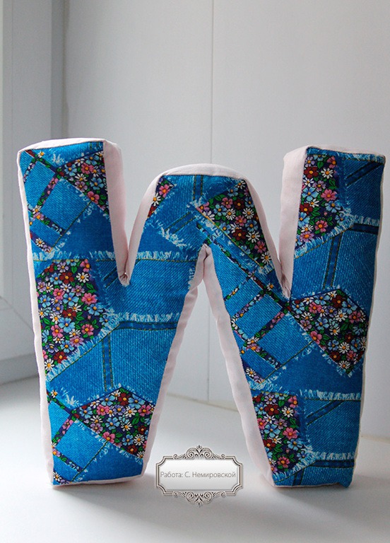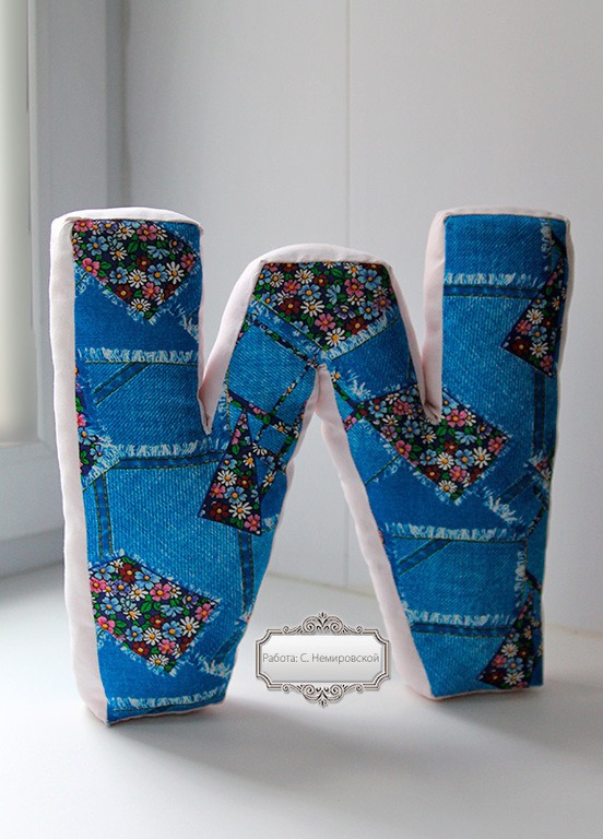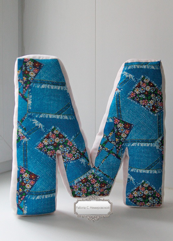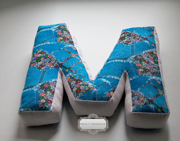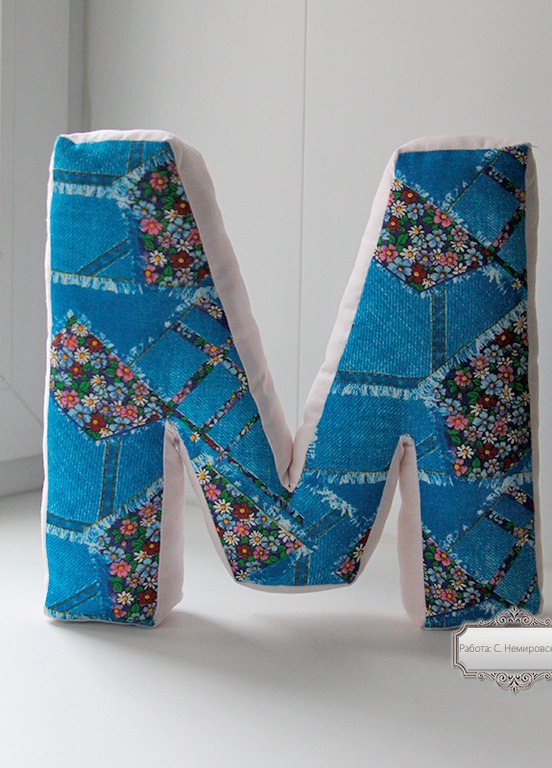 Буква-подушка сшита из натурального хлопка. Внутри гипоаллергенный наполнитель.