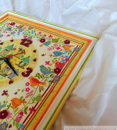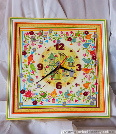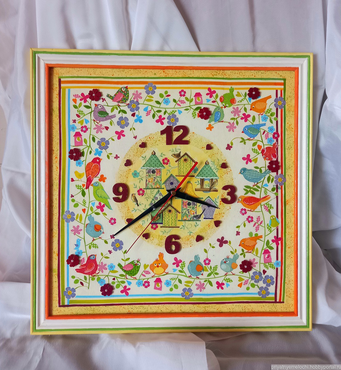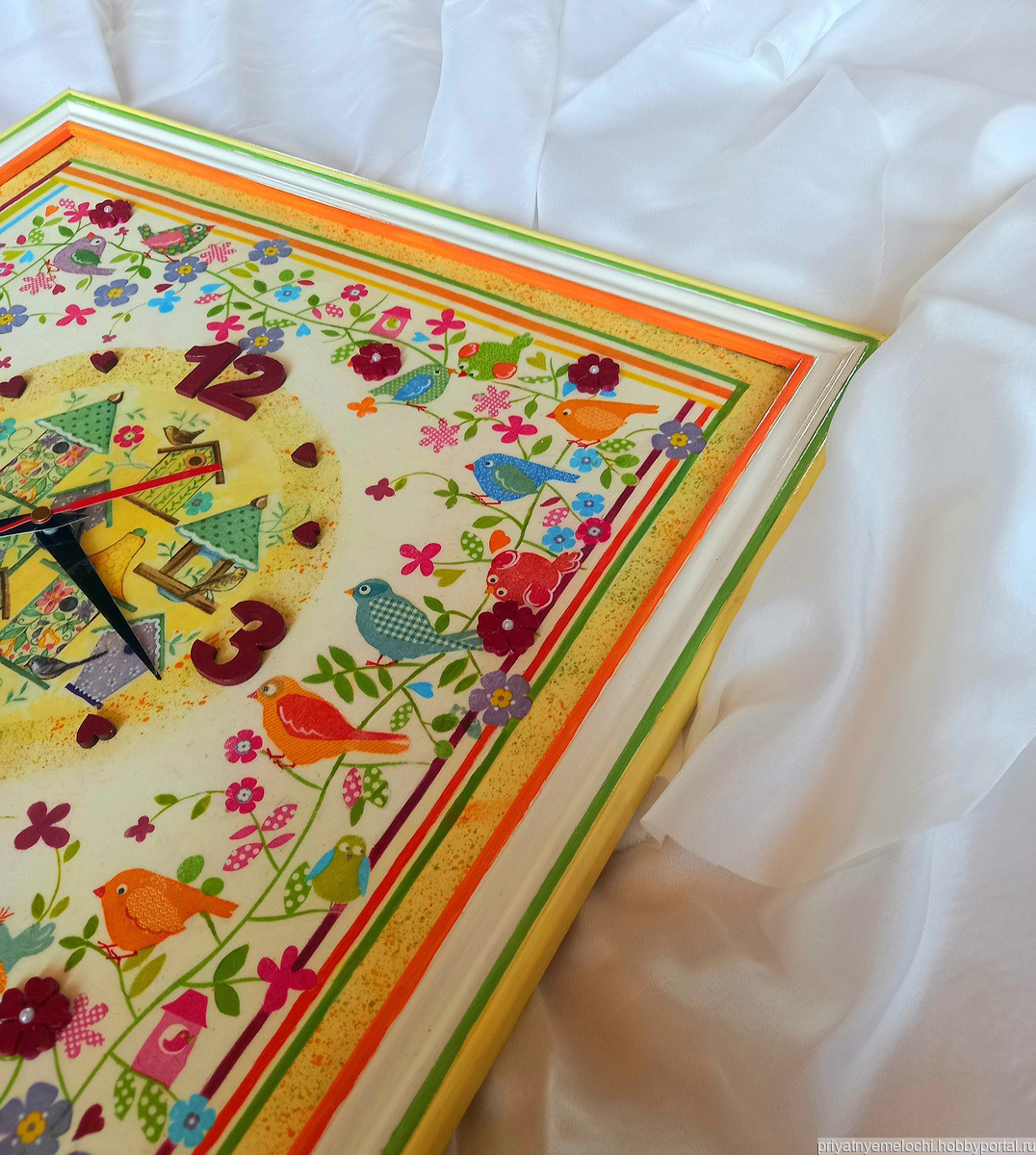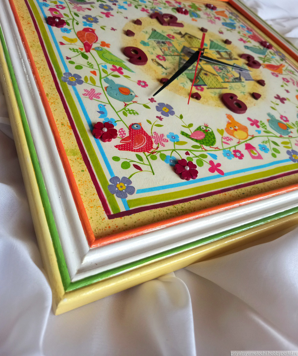 Часы в детскую комнату "Веселые трели" выполнены в технике декупаж с использованием накладных элементов из фанеры. Декоративная багетная рама создает законченность композиции. Все материалы, использованные в работе, на водной основе, не токсичны и не имеют запаха.