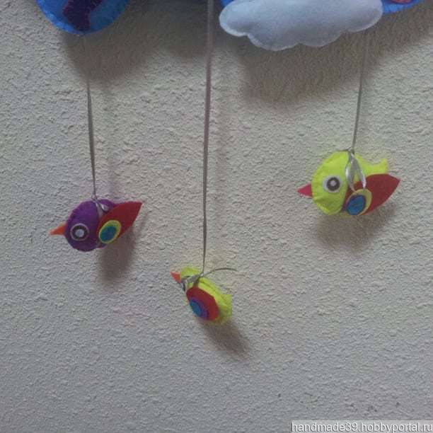 Далее когда малыш подрастет вы можете учить цвете, учить имя ребенка, считать птичек, считать количество букв и искать сколько облачков в мобиле))) Плюс птичек можно снять с мобиля и просто ими играть.