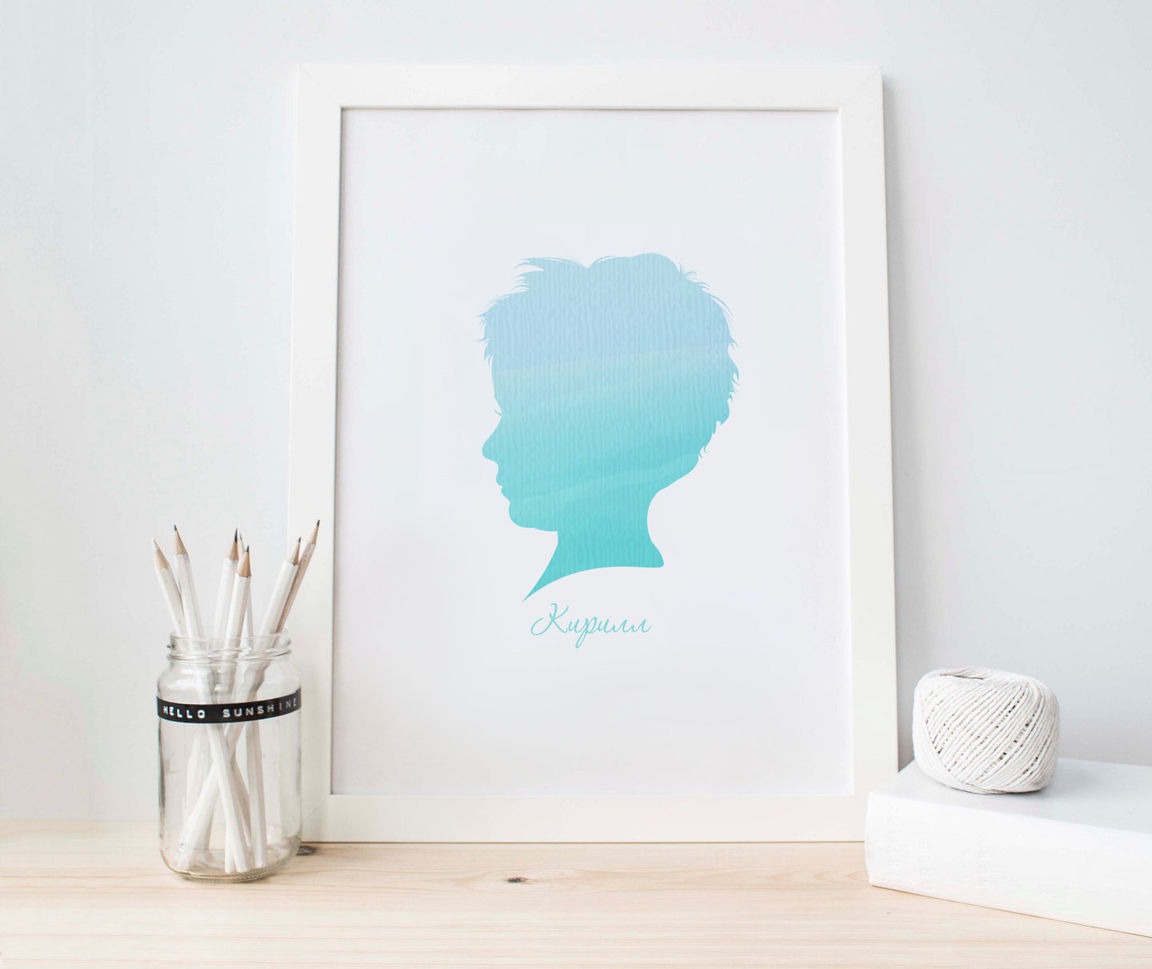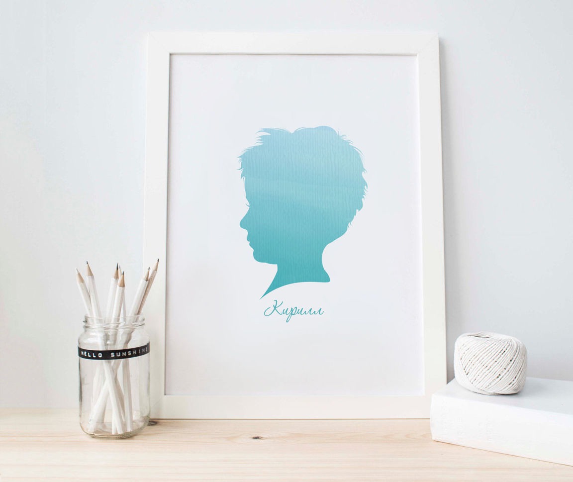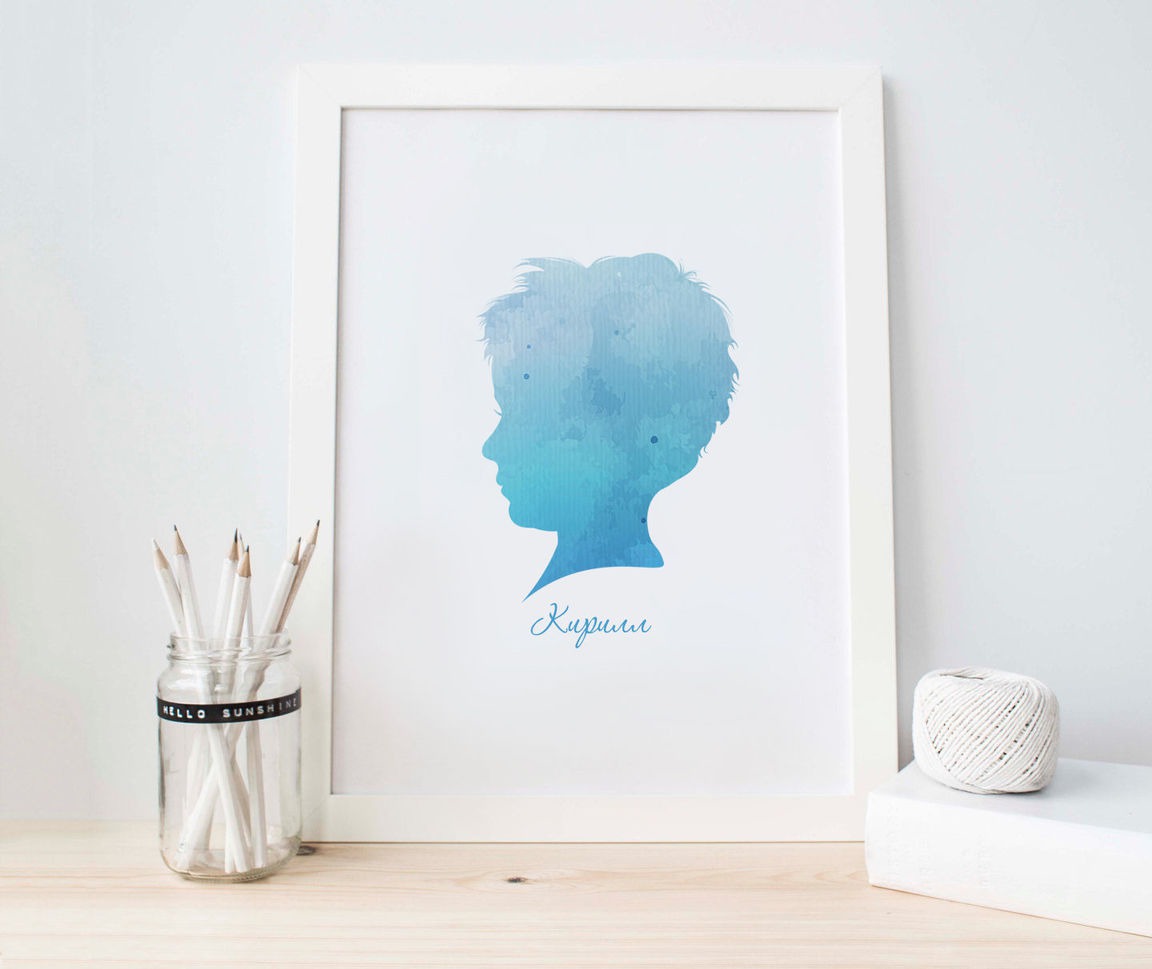 бирюзовый, голубой, синий, оригинальный подарок, подарок, для ребенка, детская, акварель, темно-бирюзовый, украшение для интерьера, Мальчику, в детскую, портрет по фото, силуэт, детский силуэт, постер, постер в детскую, на стену, в рамку, детский портрет