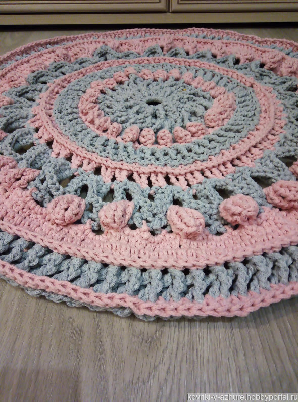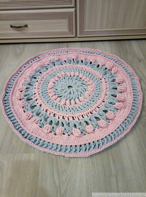 Выполнен из хлопкового шнура.Рельефный узор добавляет коврику массажный эффект. Диаметр 68 см.