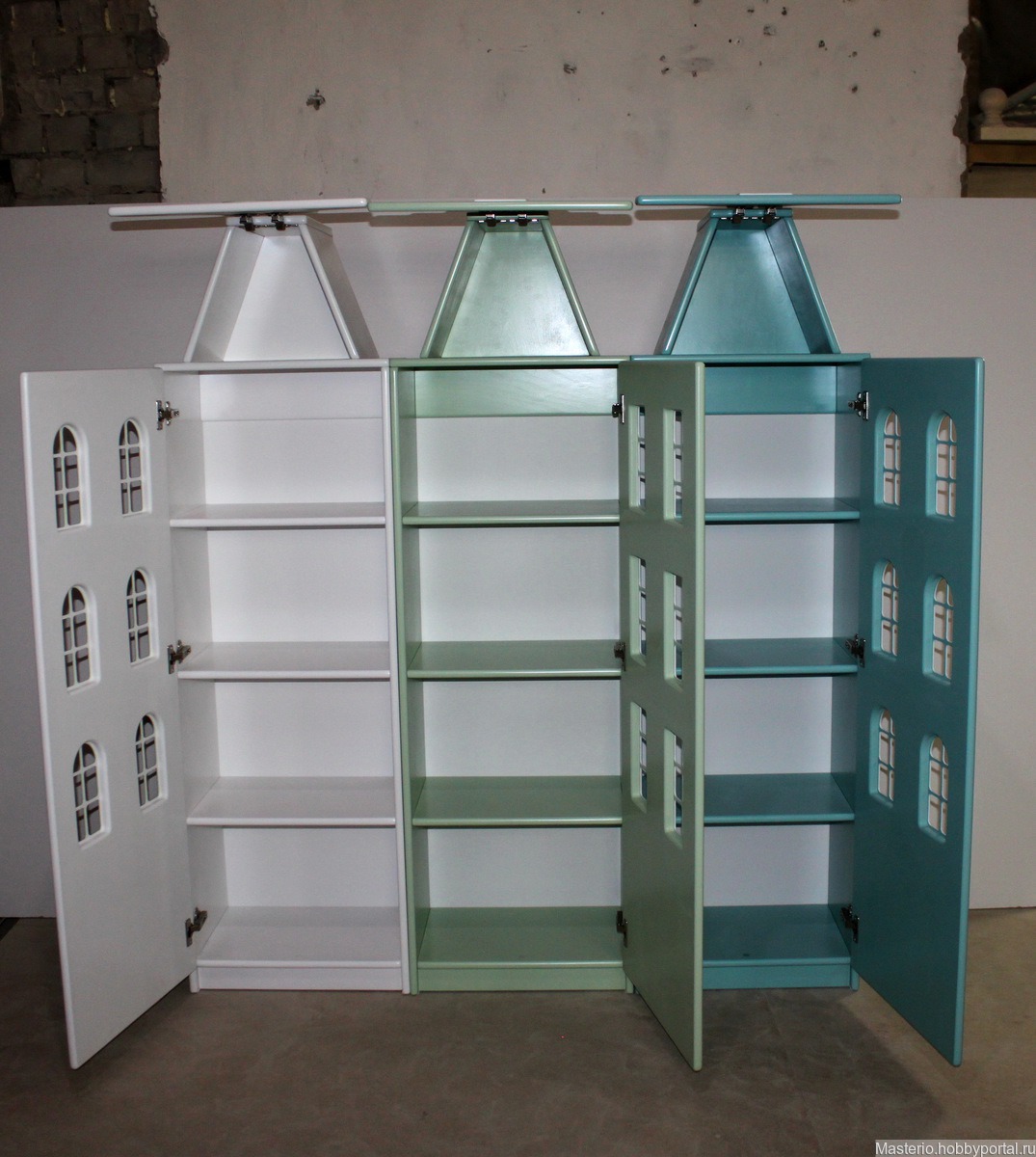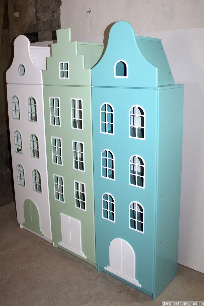 Сказочные шкафы в виде голландских домиков. Внутренняя комплектация: полки. Цвета любые. Можно дополнить выдвижными ящиками, подсветкой, вставить акриловое стекло в окошки, разнообразить фасад более детальной декоративной отделкой. Обратите внимание на мою фирменную отделку каждой детали, все края округлые, аккуратные, обрабатываются исключительно вручную. Изнаночная сторона также досконально проработана как и внешняя. Станок ЧПУ не использую, мебель ручной работы.