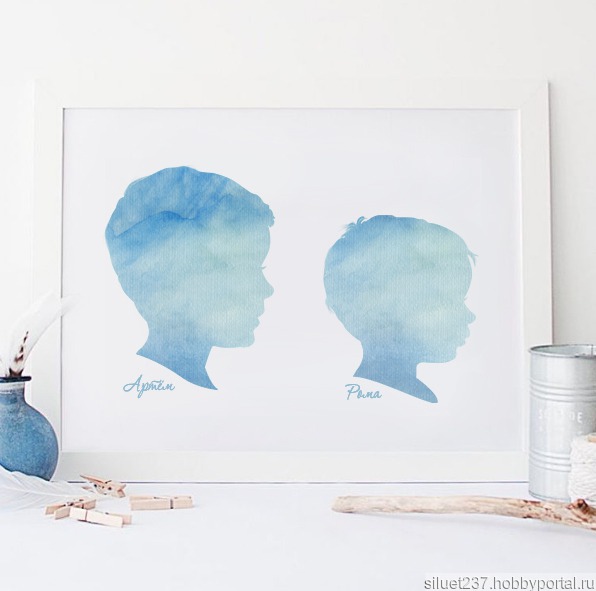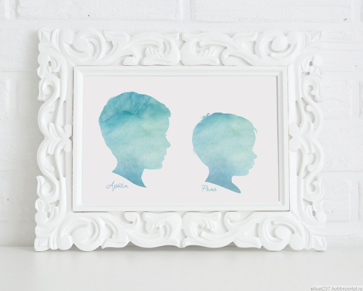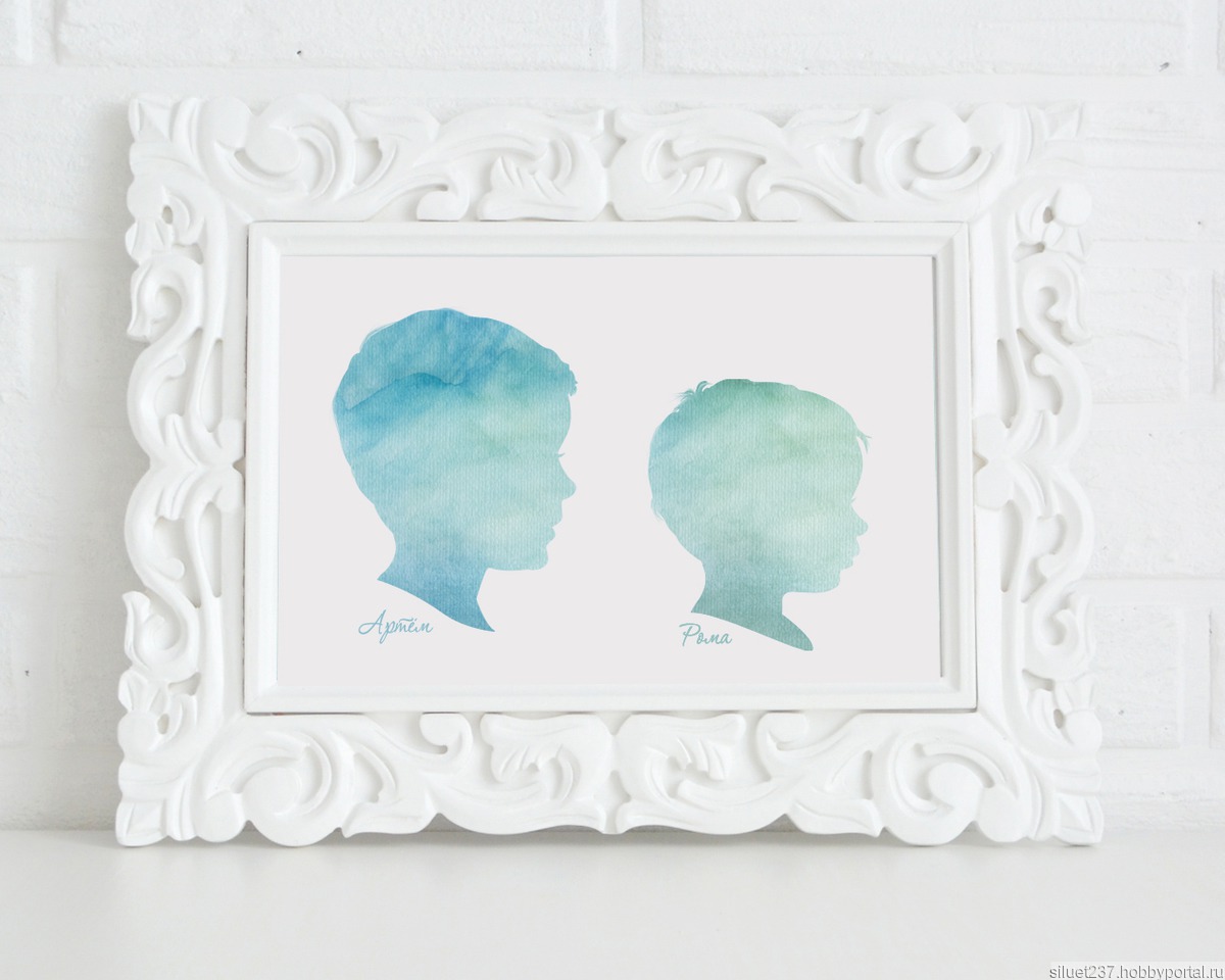 подарок, портрет, акварель, мальчик, декор детской, для детской, силуэт, детский силуэт, постер, постер в детскую, братья, детская для мальчиков, акварельный силуэт