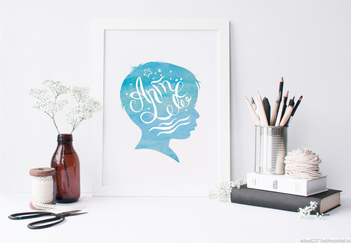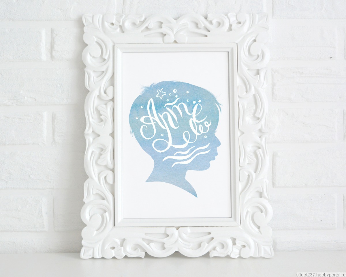 голубой, подарок мальчику, синий, подарок, на день рождения, для мальчика, акварель, украшение интерьера, мальчик, декор детской, в детскую, силуэт, детский силуэт, постер в детскую, акварельный силуэт, силуэт-портрет, силуэт-постер, акварельный постер