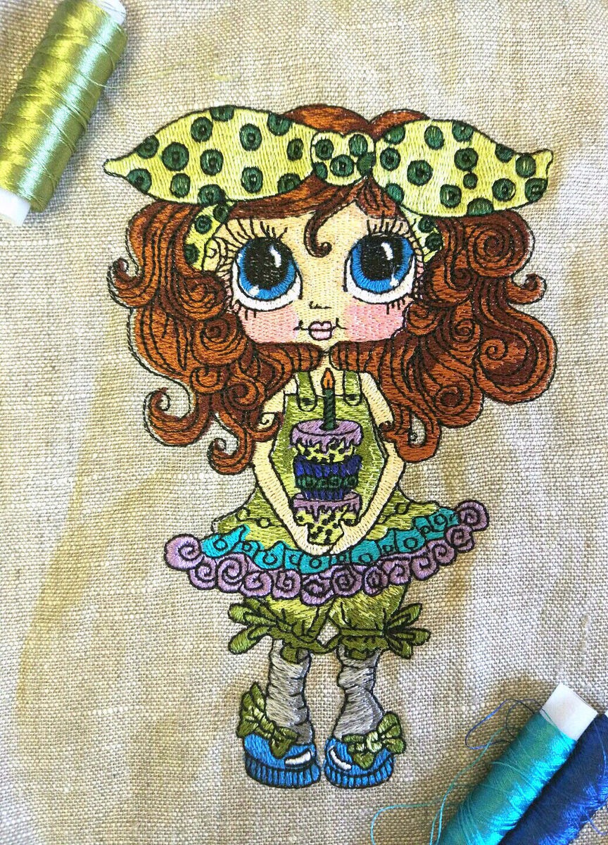 зелёный, вышивка, машинная вышивка, пэчворк, квилтинг, квилт, картина, для сумки, девочка, вставка, торт, для творчества, аппликации, кудряшки, вышивка на льне, аппликация вышитая, вышитая, элемент, квилинг, для блокнота