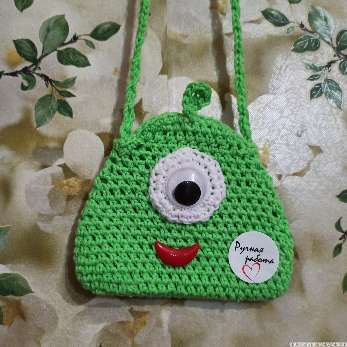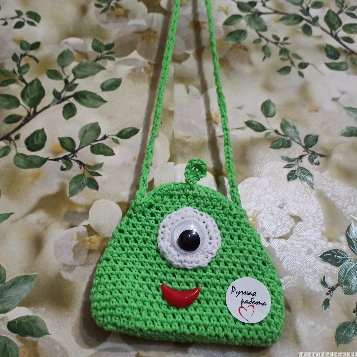 Веселая детская сумочка, ручной работы, связана крючком. Застежка на липучке.