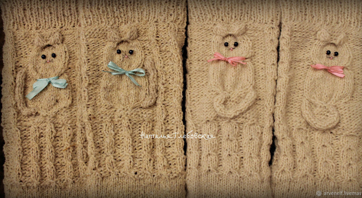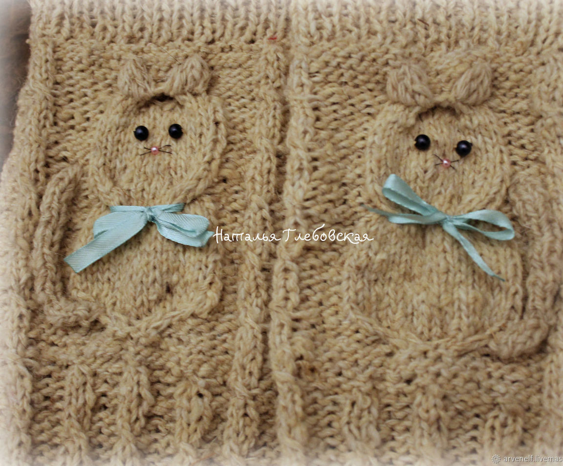 Гольфы на девочек "Кисоньки-Мурысоньки". Шерсть двух видов- чтоб различие было чисто визуально, по цвету.Бусины, ленты-у каждого котейки свой цвет. Основной рисунок-косички- тоже разный. У одной пары котиков хвостик поднят, у второй- свернут калачиком. При кажущейся схожести- у каждой девочки- своя пара котиков- совсем разных))).