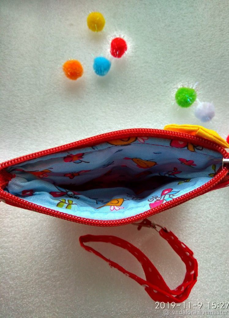 Сшит из хлопка. Внутри синтепон и подклат из весёлого детского материала. Глаза и нос из фетра. Застёгивается на замок молния. Небольшая ручка пристёгивается карабином. Можно носит не только в сумочке, но и на руке.