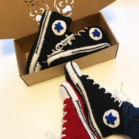 Носки-кеды вязаные. Зашнуровываются,есть язычок, внешне похожи на кеды. Так же можно связать любого цвета детские кеды от 350 р
