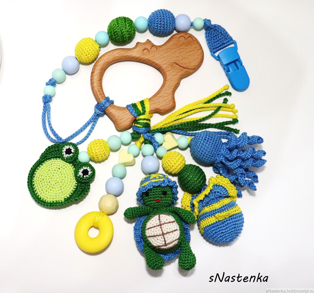 При изготовлении игрушки использовались различные материалы: буковые и силиконовые бусинки, х/б нить. Основа бегемотик изготовлен из бука и обработан льняным маслом для слюноустойчивости.